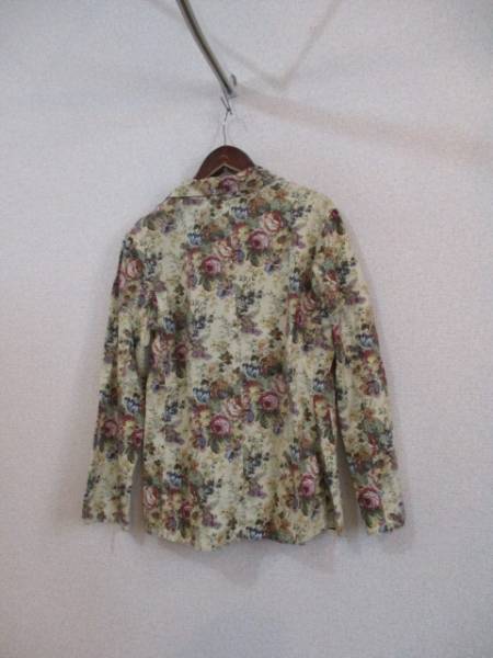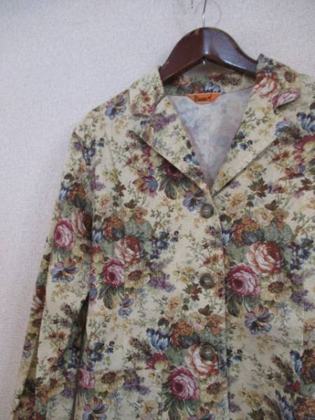 | 商品紹介 | バラ柄のゴブラン織り風プリントがオシャレなジャケットです。 地色はベージュです。 シンプルなテーラードの形で、胸から下、縦に切替えが入っています。 ※柄はプリントで織柄ではありません。 《素材》 綿100% |
