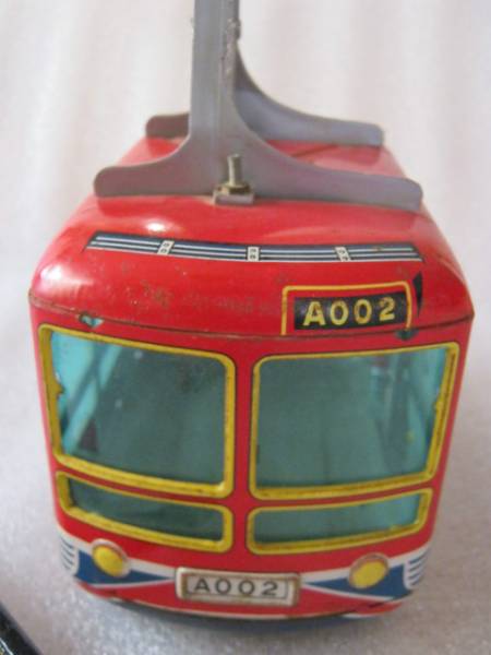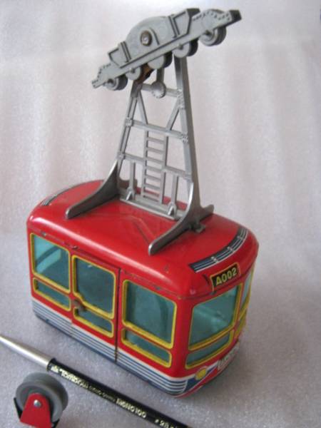 全長約26cm、高さ約21cmの堂々たる大きさのブリキ製ロープウエーのカゴです。ドアが開閉できるなど、凝ったつくりになっています。1960年代の製品と思われます。ハコ部分はブリキとセルロイド、吊りフレームはプラスチックです。ロープにつるして遊ぶおもちゃだったと思いますが、ロープが通る車輪が一個だけ残っています。