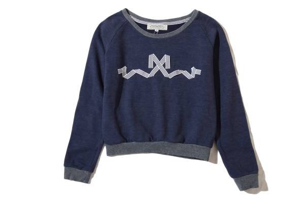ネイビーの本体に、ネック、袖口、裾のリブ部分はグレー、