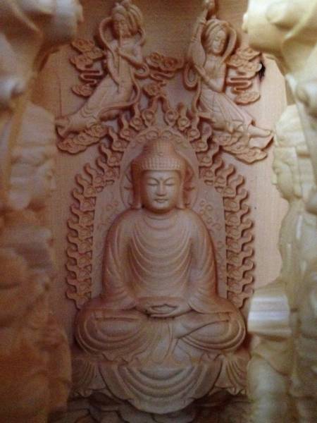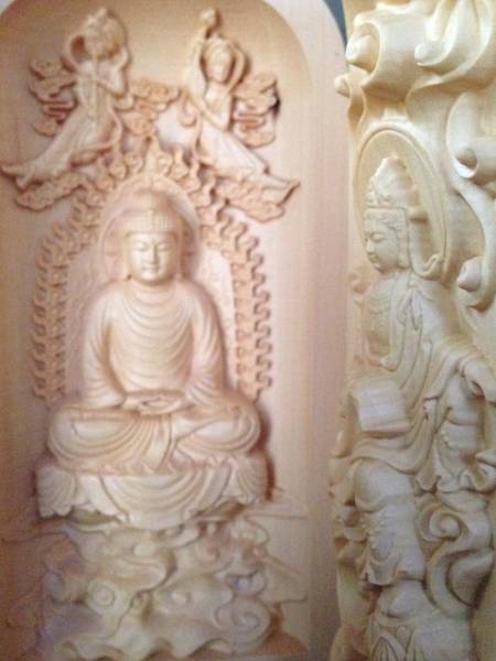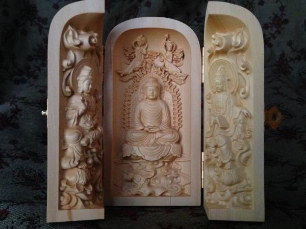 卍超細密 木彫り仏像 ◆釈迦 三尊◆ 開閉式 小サイズ仏壇 仏箱 | ||||