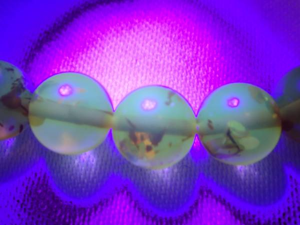 天然琥珀なので、3枚目の写真はブラックライトを当てて撮った写真です。