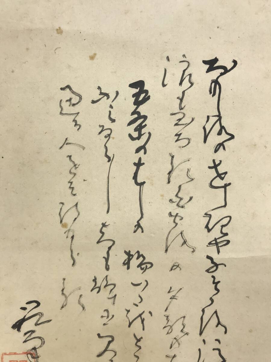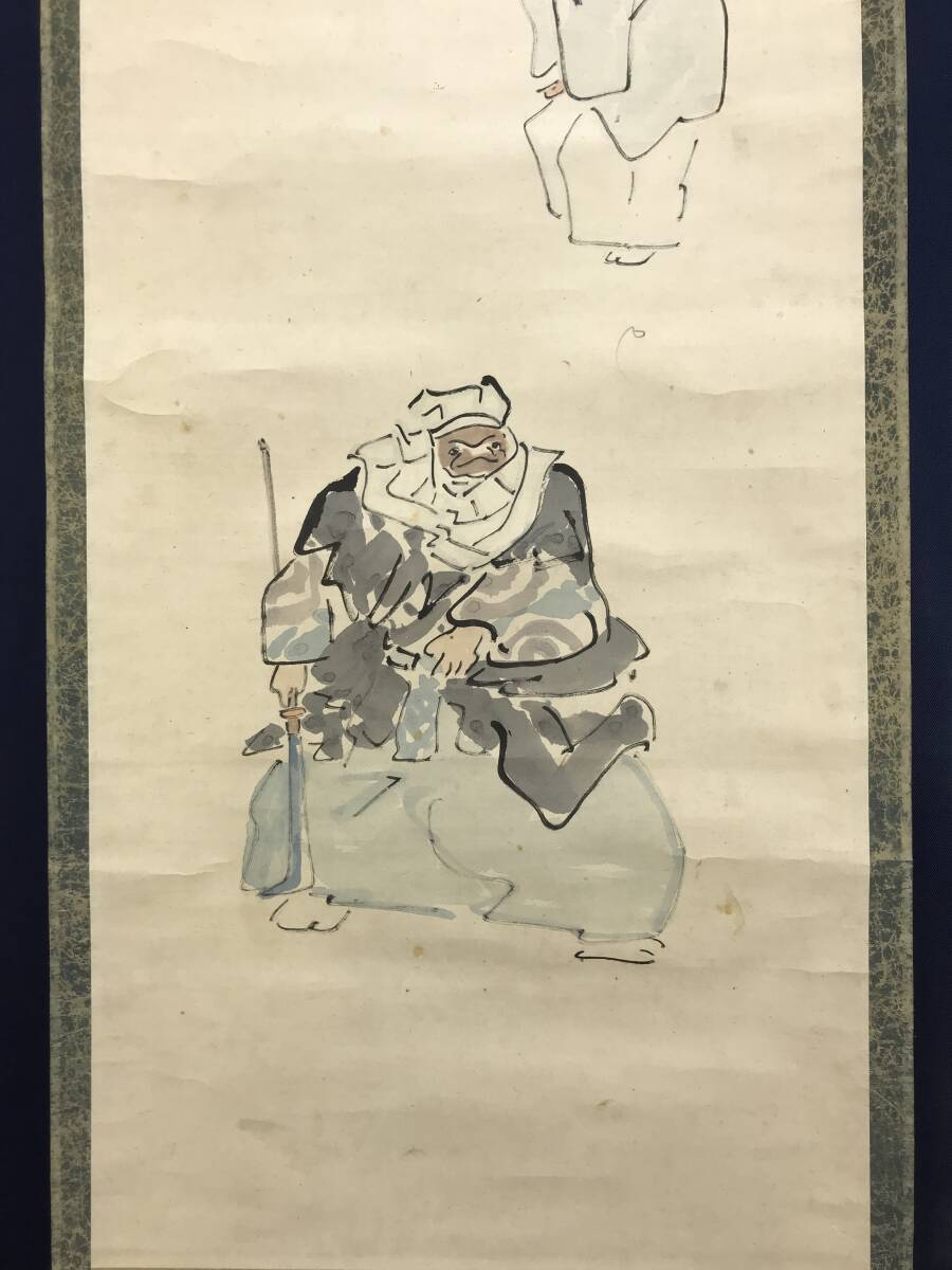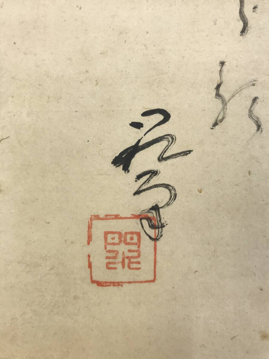 【作品状態】 本紙は紙本肉筆です。本紙は薄汚れ、全体に糊シミ、多少の汚れ、巻シワあります。表装はもみ紙表装で、天地に折れ、巻シワあります。