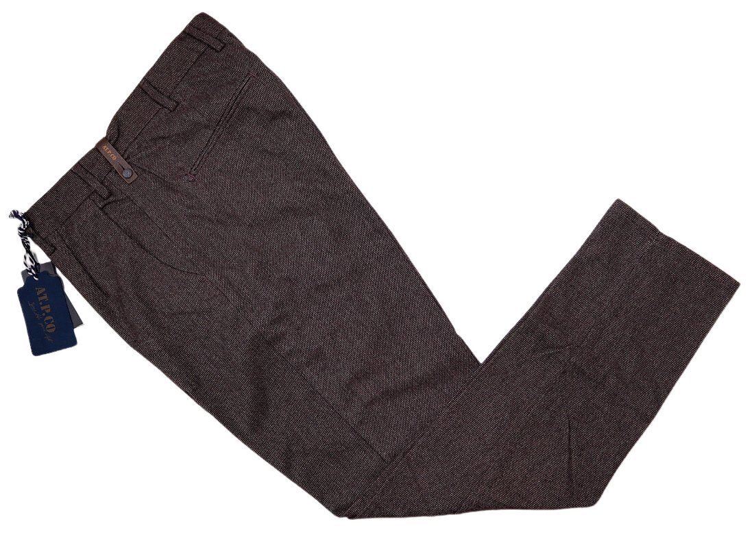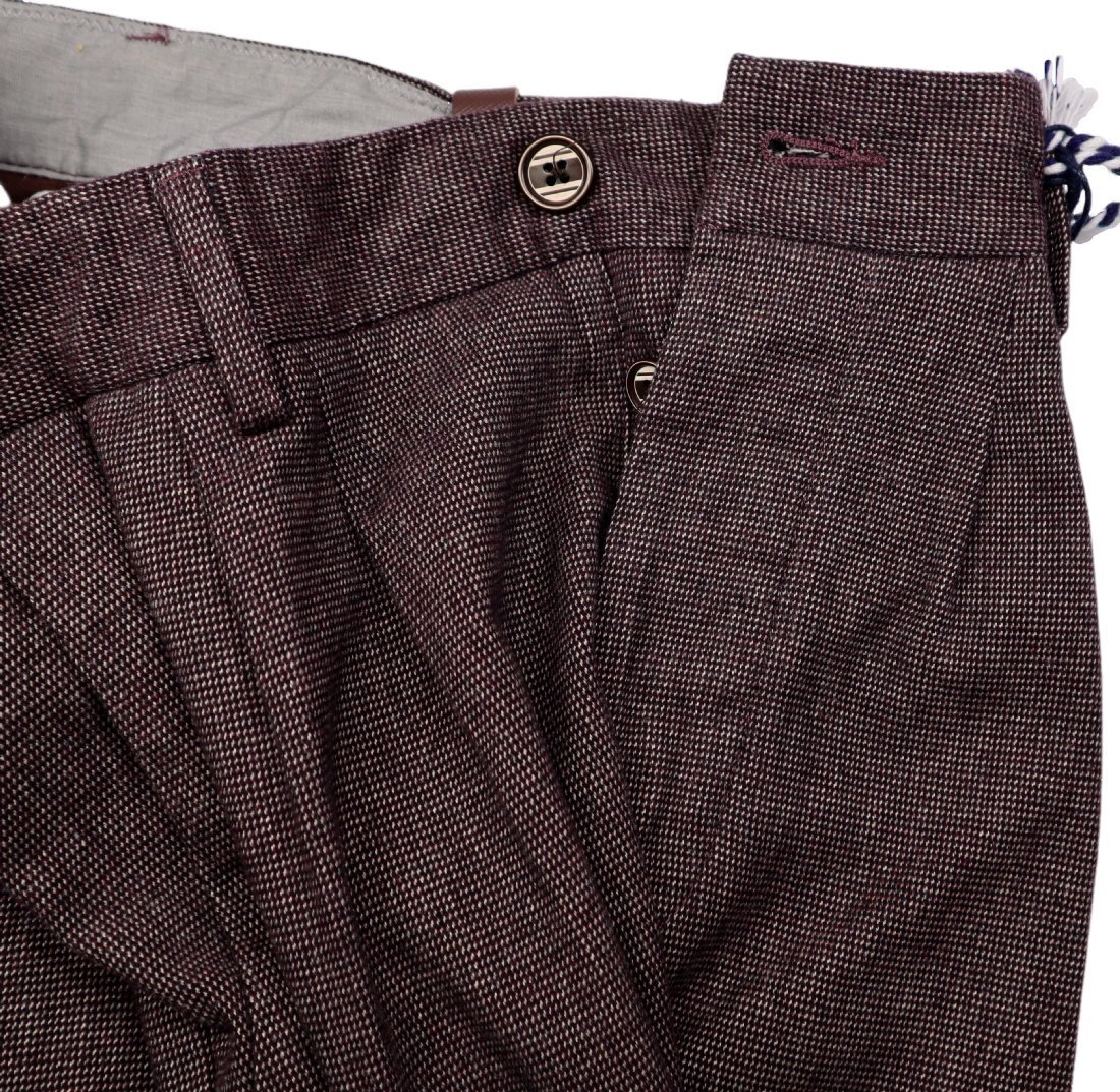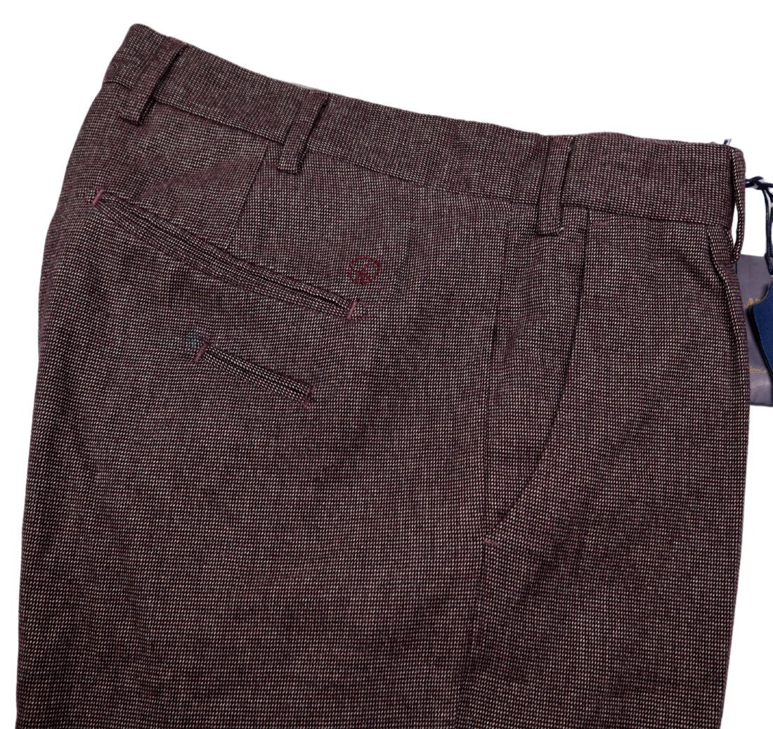 ほんのり赤みのあるブラウンとブラックとホワイトの糸から構成される上品なカラーリング。ほのかに起毛したコットン素材です。モダンな2プリーツ、ヒップのチェンジポケットやデザイン刺繍、洒脱なボタンのレザーベルトループ、デザインナットボタン、ライニングのシャツ生地仕様など、洒落たディテールが満載です!