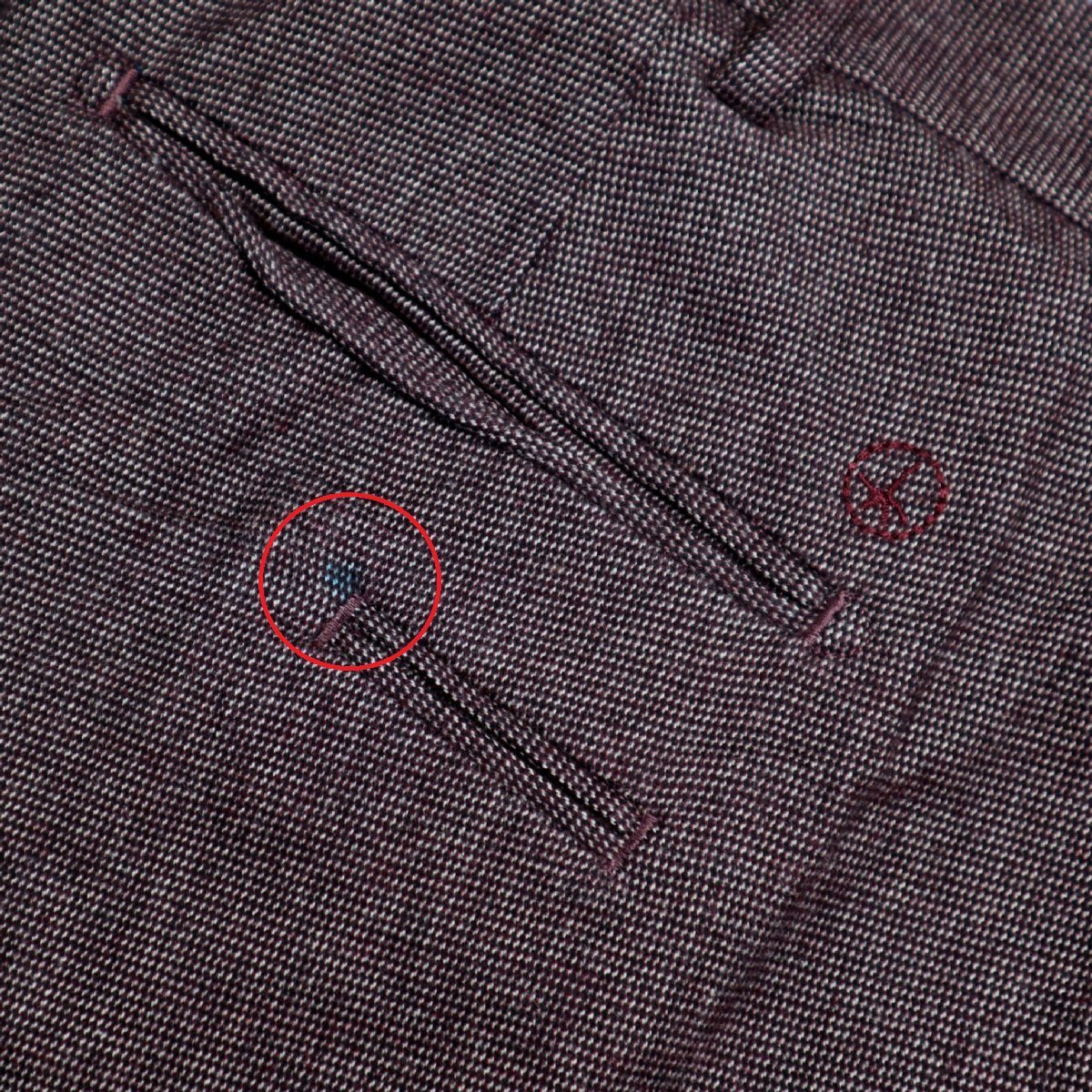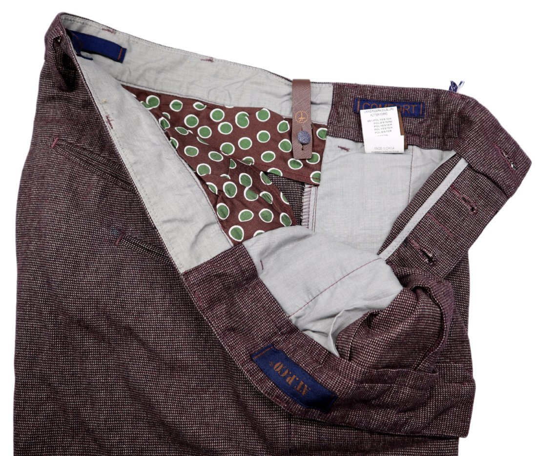 2プリーツ ヒップ・1ダーツ & 玉縁ポケット & チェンジポケット ブランドアイコン刺繍 D管留め レザーベルトループ(着脱可能)&デザインボタン ライニング・デザインシャツ生地仕様 パイピング仕様 デザイン本ナットボタン  モデル名タグ(ハンガーループ) 「COMFORT」内タグ 九分丈 ケアラベル ボタンフライ