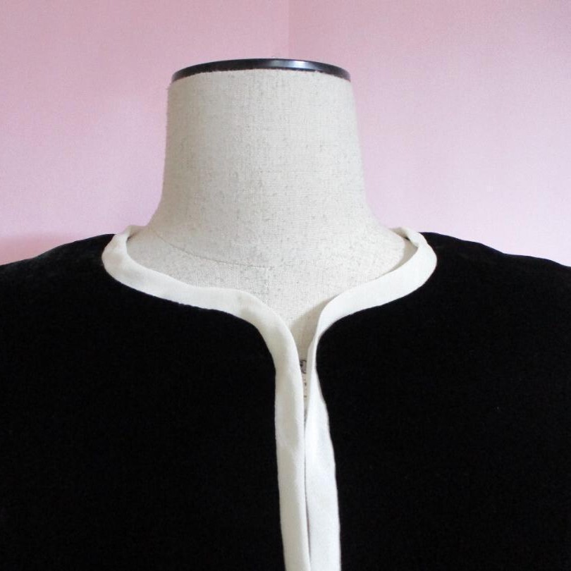 プラステの黒にアイボリーのバイピングがオシャレ上級者のノーカラージャケット
