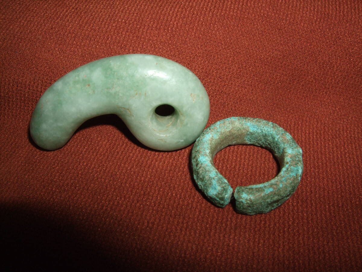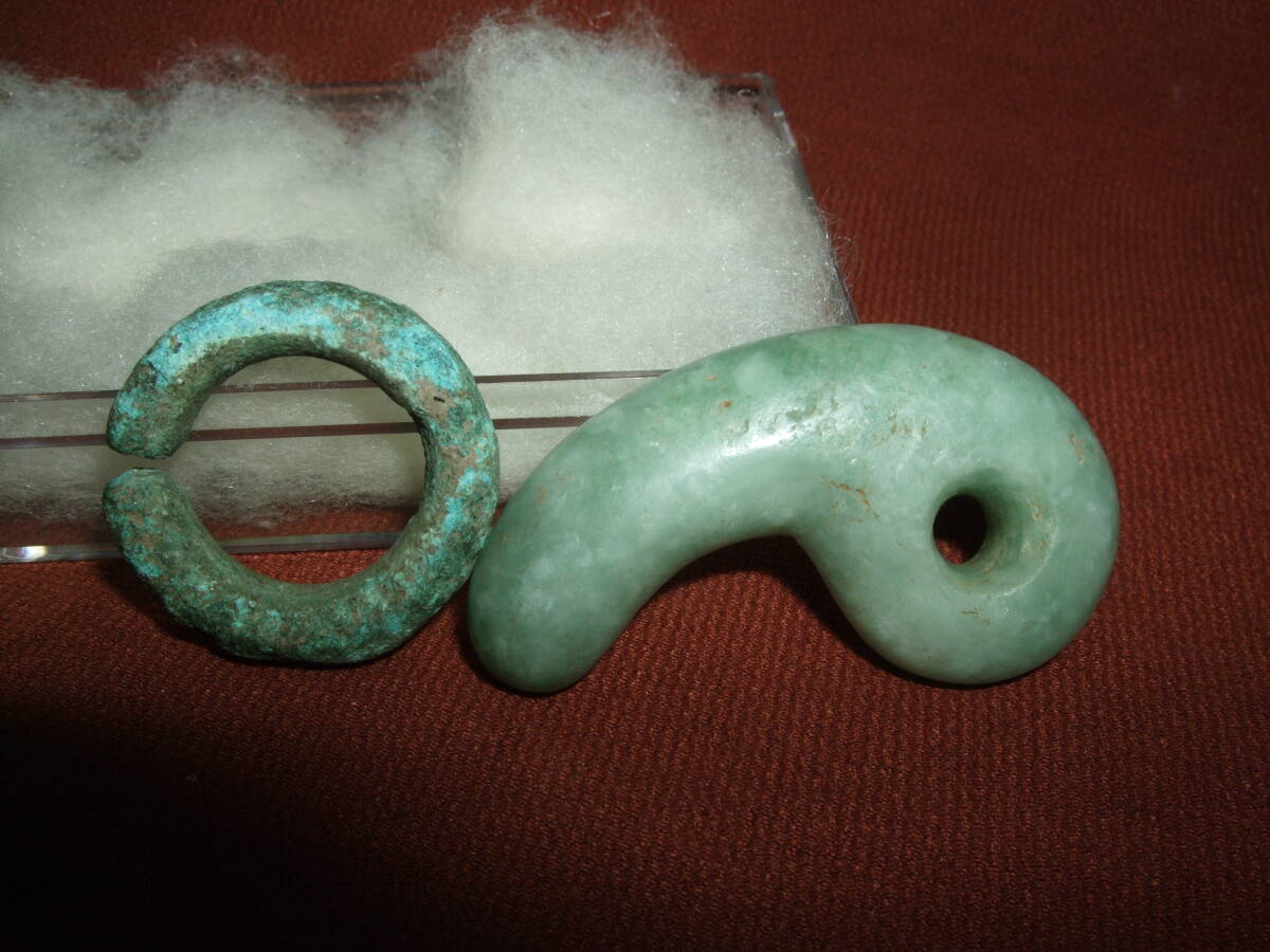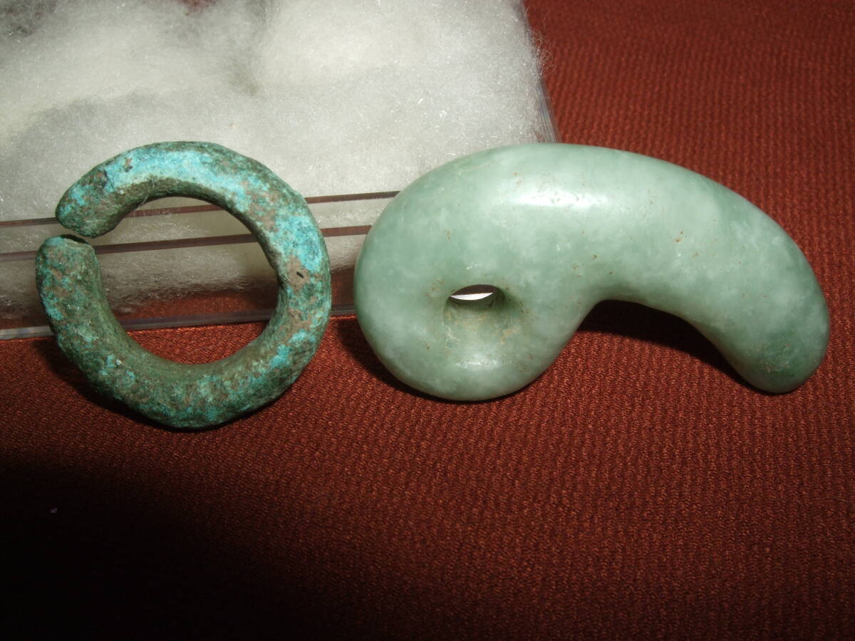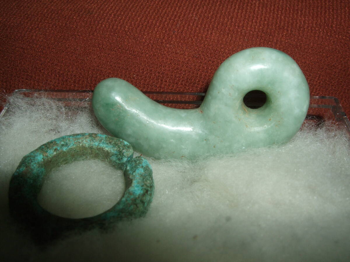 古墳出土の青銅耳環と透明感のある淡い緑色が美しい翡翠勾玉です。青錆びの良い耳環と古代のぬくもりが感じられると翡翠勾玉です。 勾玉約4.5cm 伝 畿内出土