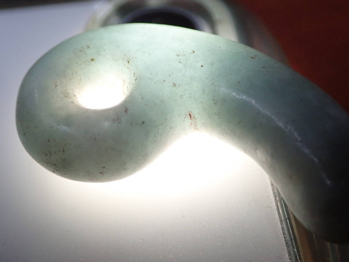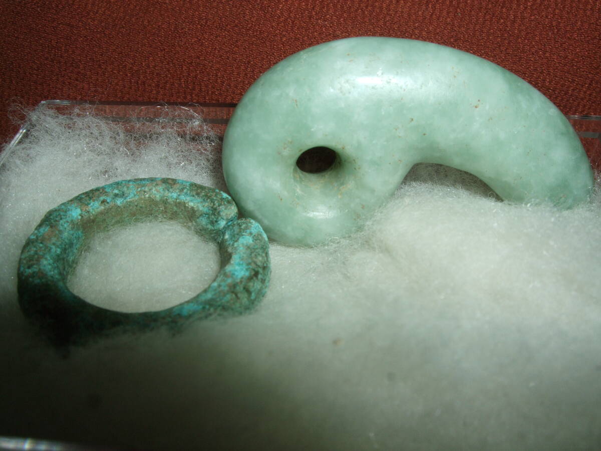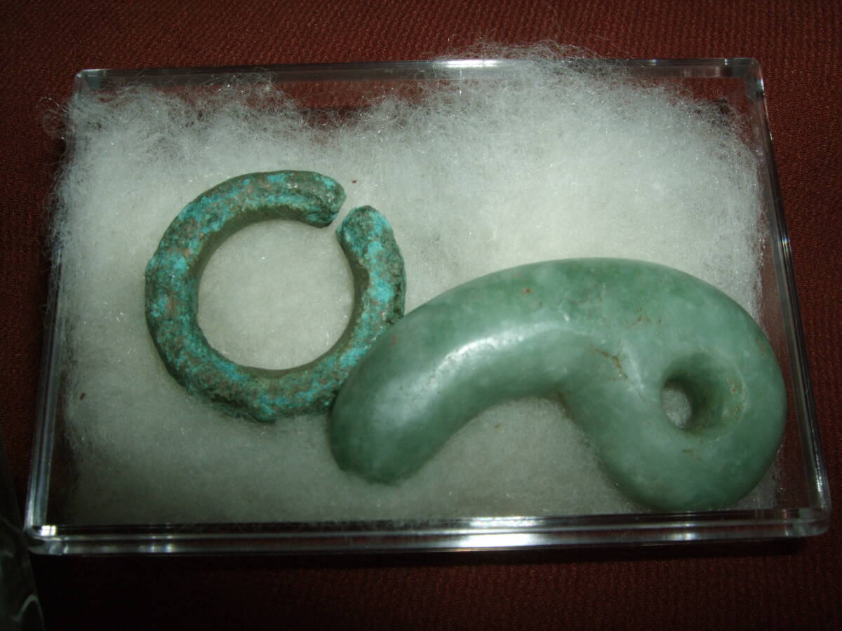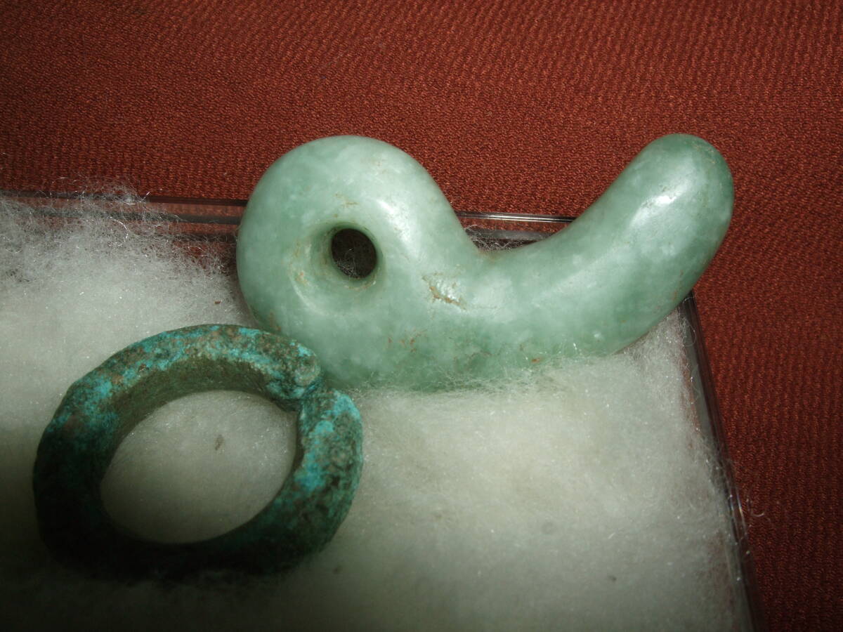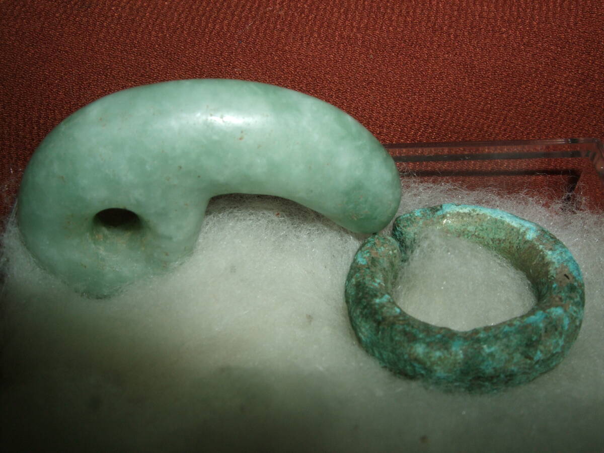 古墳出土の青銅耳環と透明感のある淡い緑色が美しい翡翠勾玉です。青錆びの良い耳環と古代のぬくもりが感じられると翡翠勾玉です。 勾玉約4.5cm 伝 畿内出土