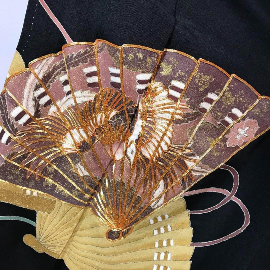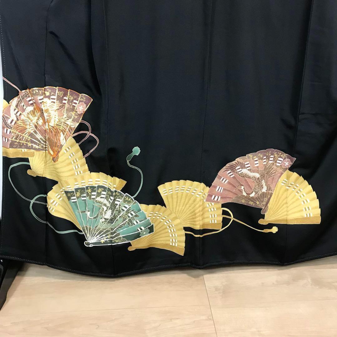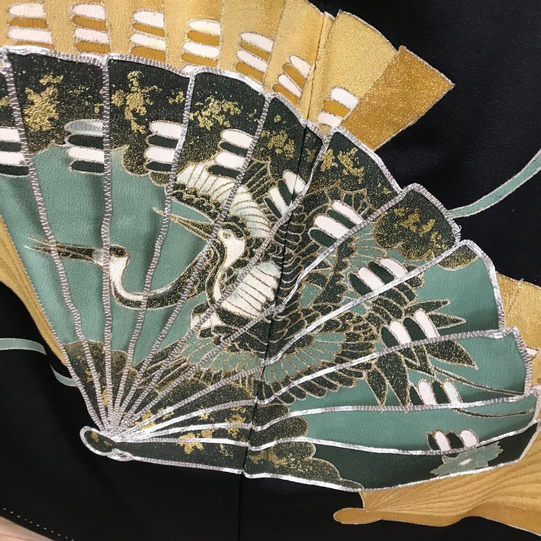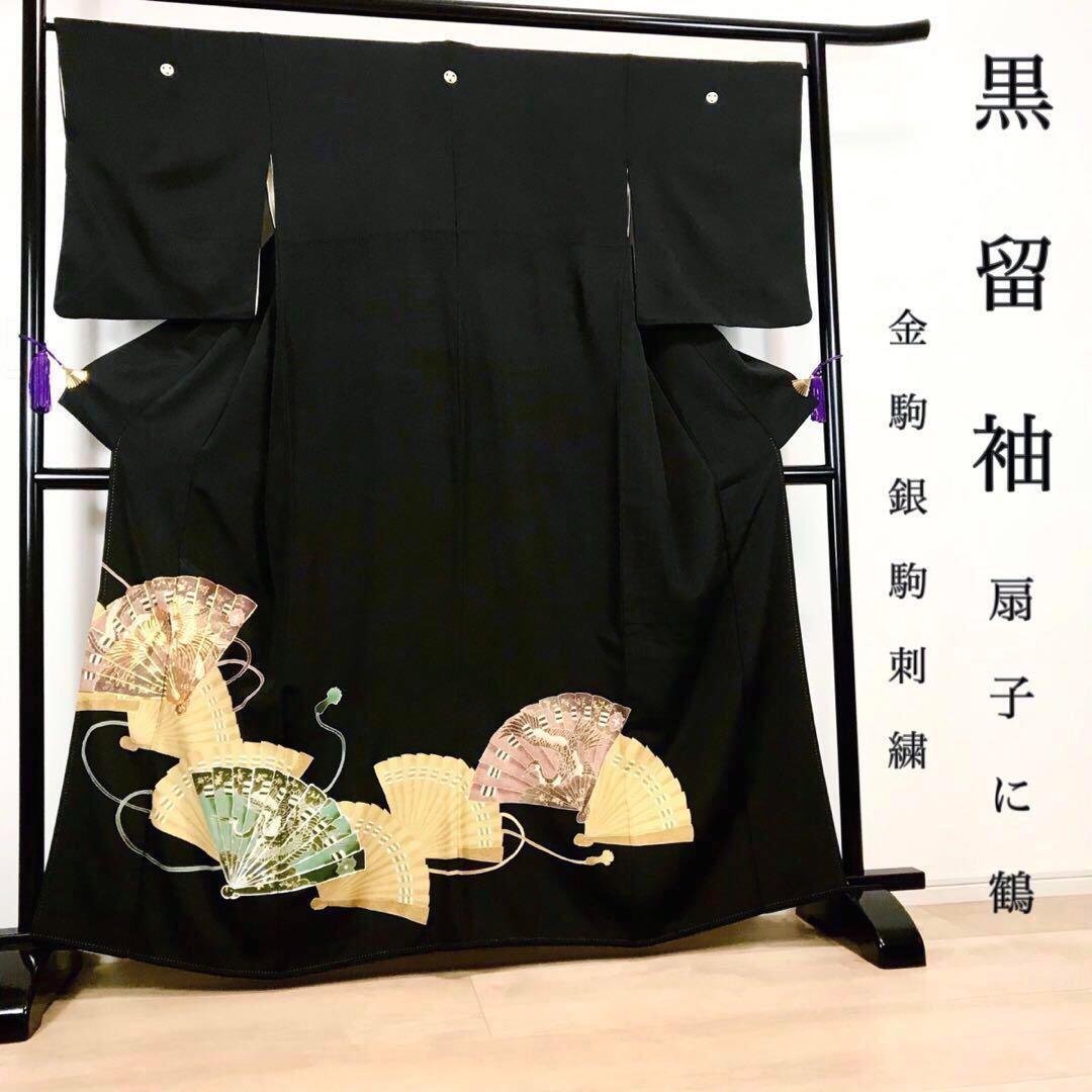 ZF-1113 黒留袖 扇子 鶴 金駒刺繍 銀駒刺繍 正絹 比翼仕立 逸品