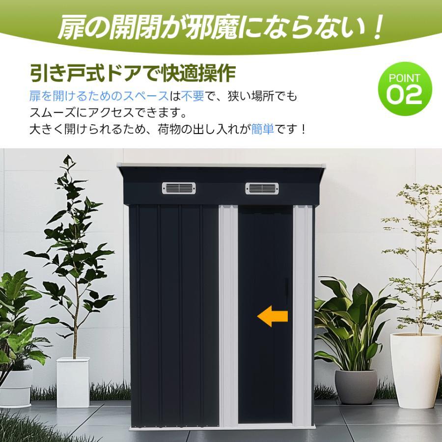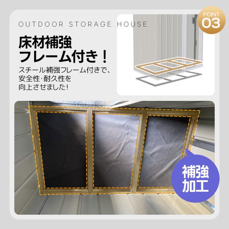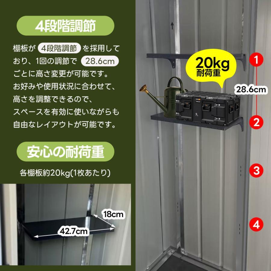◆01大容量でスッキリ収納 コンパクトサイズで2197Lの容量のモノを収納可能。 ガーデン用具や季節ごとのアイテムなど、室内で置きにくいものもスッキリ片付けられます。 ◆02扉の開閉が邪魔にならない!引き戸タイプ 扉を開けるためのスペースは不要で、狭い場所でもスムーズにアクセスできます。 大きく開けられるため、荷物の出し入れが簡単です! ◆03床材補強フレーム付き! スチール補強フレーム付きで、安全性・耐久性を向上させました! ※床材は付属しておりません。お客様にてご準備をお願いいたします。 ◆04 4段階調節 棚板が4段階調節を採用しており、1回の調節で28.6cmごとに高さ変更が可能です。 お好みや使用状況に合わせて、高さを調整できるので、スペースを有効に使いながらも自由なレイアウトが可能です。 安心の耐荷重 各棚板約20kg(1枚あたり) ◆05しっかりとした頑丈な素材 ハイテンション亜鉛メッキ鋼板採用! 有害物質が発生しない環境に配慮した粉体塗装仕上げで、衝撃に強くサビにくい特徴があります。 外部には特別な防水加工が施され、製品全体が防水・防錆効果が優れています。 ◆06衝撃に強く凹凸壁面 壁面には特有の凹凸形状が採用されています。 通常商品の平滑な壁面と比較して、凹凸部分が外部からの衝撃や圧力を分散し、全体的により安定感が増しています。 ◆07排水に役立つ屋根 屋根は本体よりも広く、斜面が設けられています。 雨が降ると、屋根にたまることなく、斜面と凹槽を経由して地面に流れ落ちます。これにより、物置内に雨が侵入する心配がなく、内部の部品をより良く保護します。 ご注意:完全な防水仕様ではありませんので、事前に防水処理を行うことをお勧めします。 ◆08空気を循環させて、室内の温度と湿度を快適に保ちます。 ◆09屋根の耐荷重について 屋根の耐荷重は一般的に1平方メートルあたり30kg程度です。 通常の積雪には耐えられますが、積雪が多い場合は早めに雪かきを行ってください。積雪や台風などの自然災害による損害については、保証できませんのでご了承ください。積雪地域や台風の影響を受けやすい地域では、必要に応じて屋根の補強をお勧めします。 補強キットは当店では取り扱っておりませんので、お近くのホームセンターなどで補強材をご購入ください。 ◆10その他の安心対策 #1.プラスチック屋根カバー 収納庫の屋根を補強できます。 #2.取っ手付き 取っ手付きで、開け閉めがスムーズに行えるため、収納物へのアクセスも簡単です。 #3.手袋付き 作業用の手袋をご用意しております。