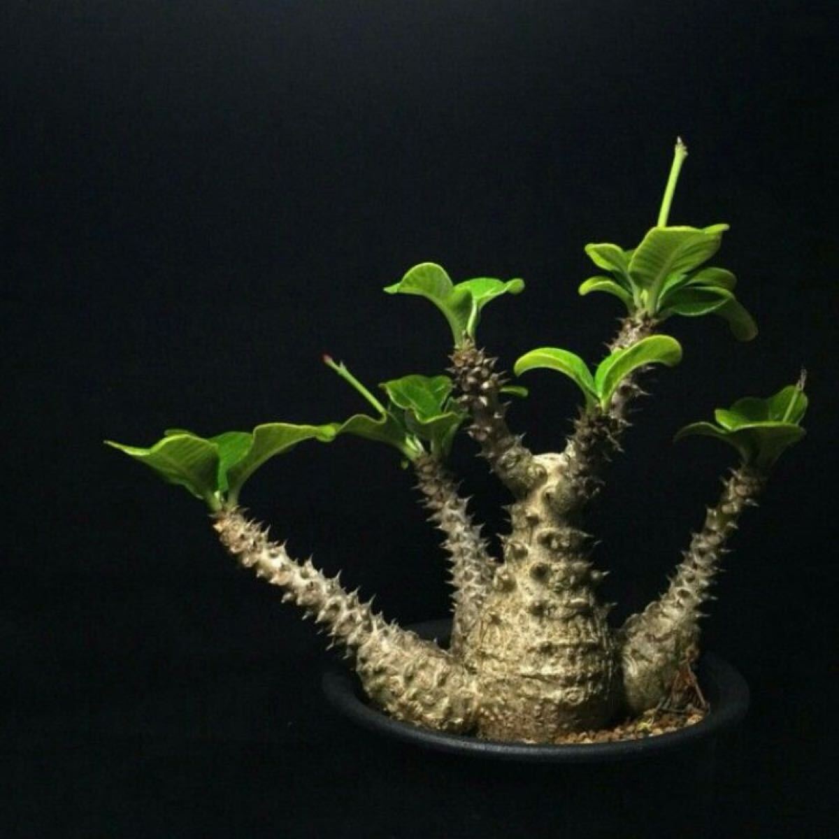 マダガスカル固有の希少なパキポディウムで、コンパクトな樹形と白〜ピンク色の花が特徴です。塊根は膨らみやすく、盆栽のような魅力があります。栽培は高温多湿と排水性の良い土壌を好み、種子からの発芽も比較的良好です。コレクター人気も高く、流通量の少ない希少種です。