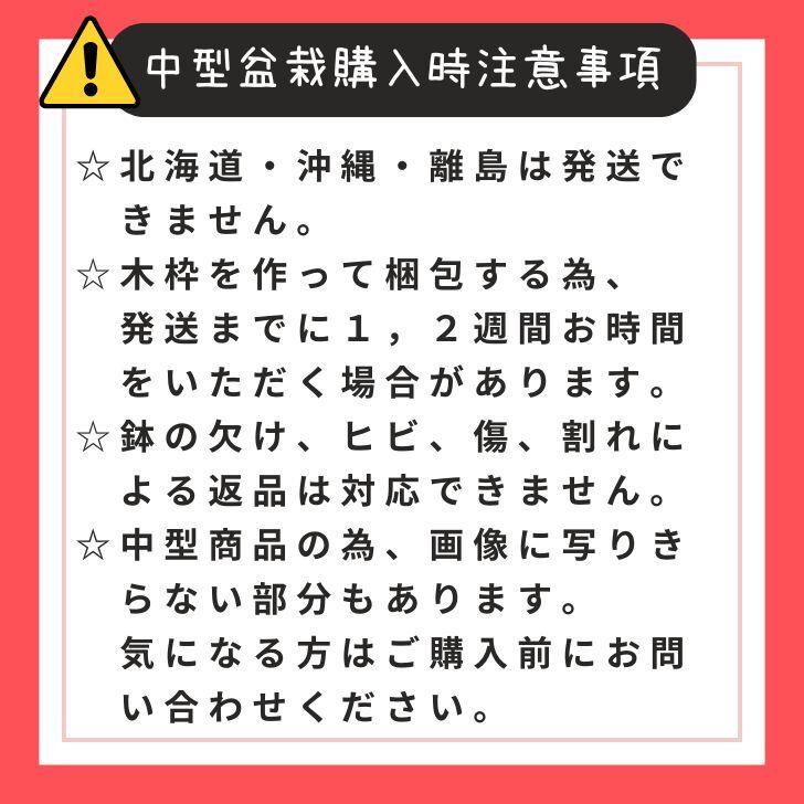 | 中型盆栽 ※木枠を作って梱包する為、発送まで1.2週間かかる場合があります。 ※鉢の欠け、ヒビ、傷、割れによる返品は対応できません。 ※画像に写りきらない部分もあります。 ※気になる方はご購入前にお問い合わせください。 |