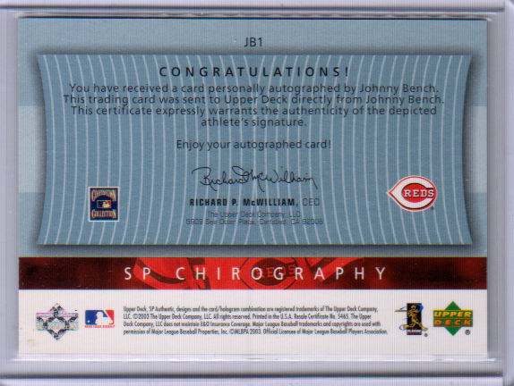 Johnny Bench ジョニー・ベンチ Auto 直筆サイン Upperdeck SP Authentic Chirography 2003