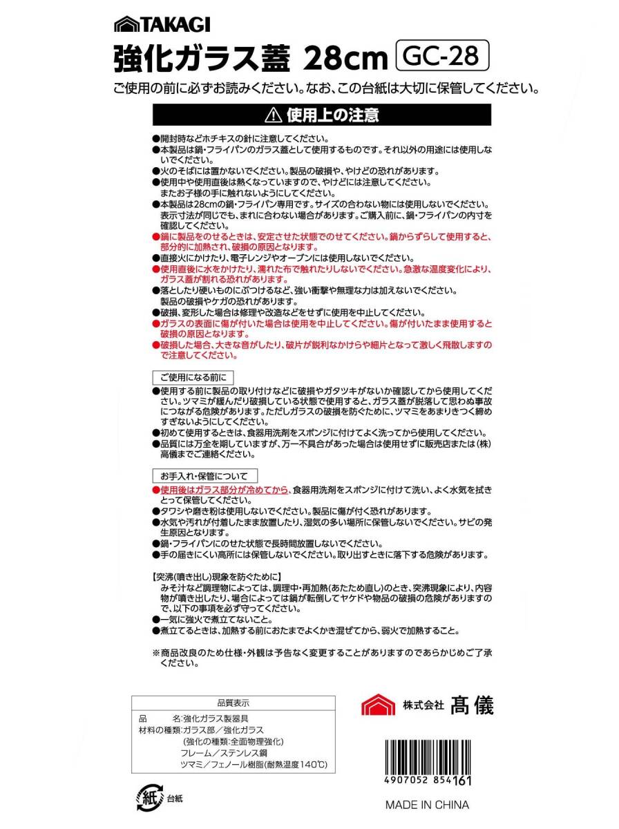 高儀 TAKAGI 強化ガラス蓋 28cm