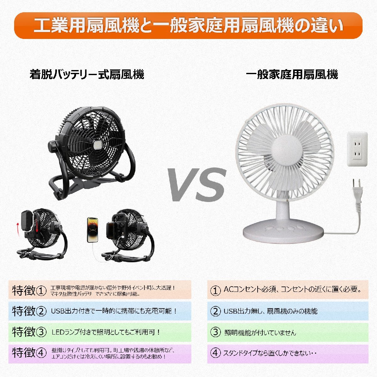 ★オススメポイント★ バッテリー着脱可能! バッテリーは着脱式なので、対応バッテリーがあれば長時間使用可能! 持ち運びに便利! 軽量なボディのため持ち運び・取り回しに便利。 多彩な使い方 壁掛け・吊り下げ・床置き・手持ち!シーンに合わせて柔軟に対応! 軽量ボディ 本体約1.77kg!持ち運びにも負担になりにくい! 蓋は取り外し可能なので、気になる汚れを洗って清潔を保てます! USB出力口付き スマホなどUSB端末に充電可能! 緊急用のモバイルバッテリーとしてもご使用いただけます! |