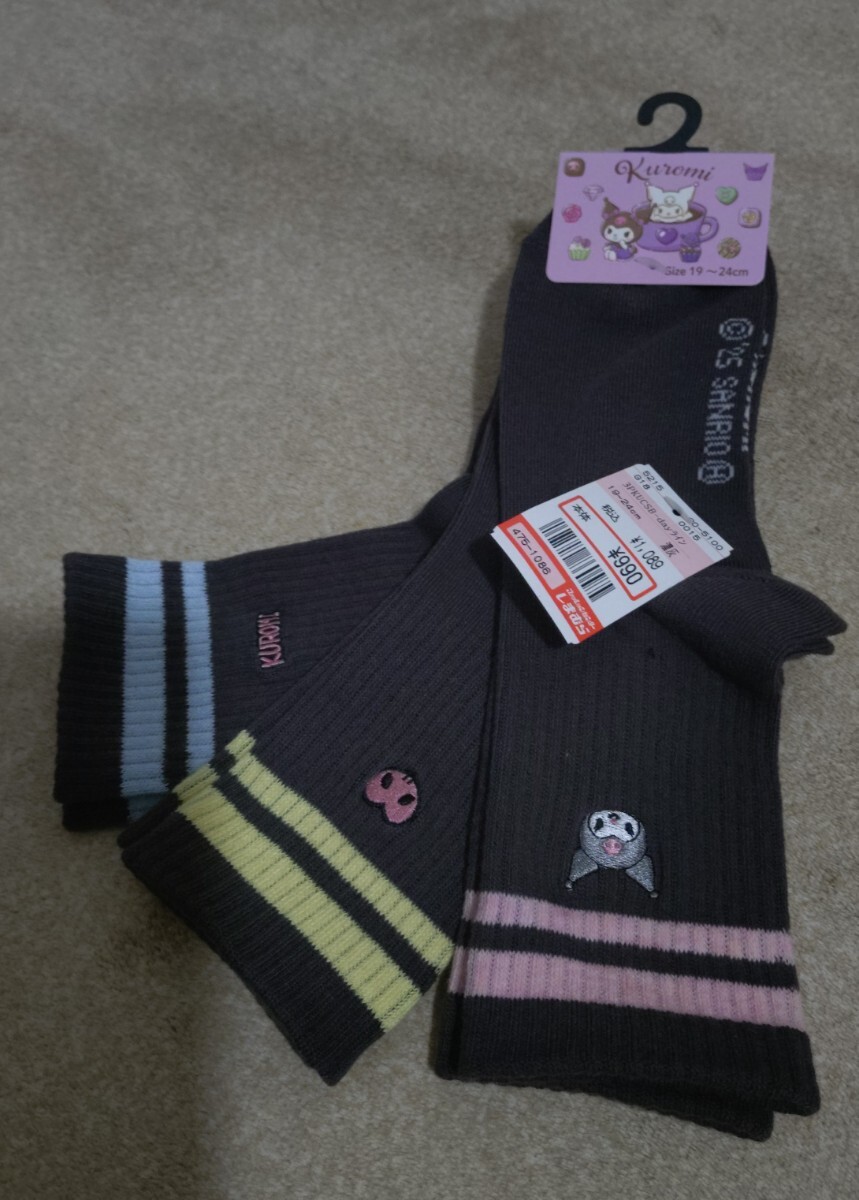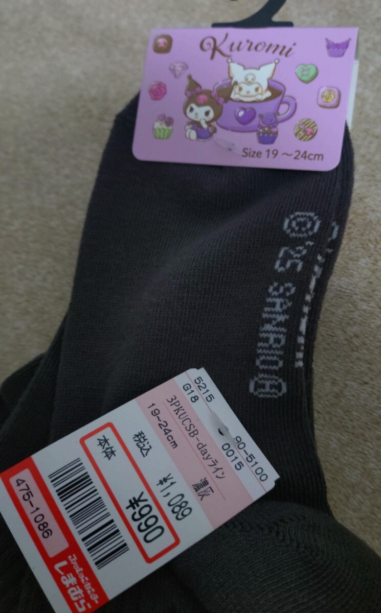 しまむらのサンリオ クロミのソックス3足セット。未使用。女性、19〜24cm。キッズサイズですが、足のサイズが小さい方は履けそうです。