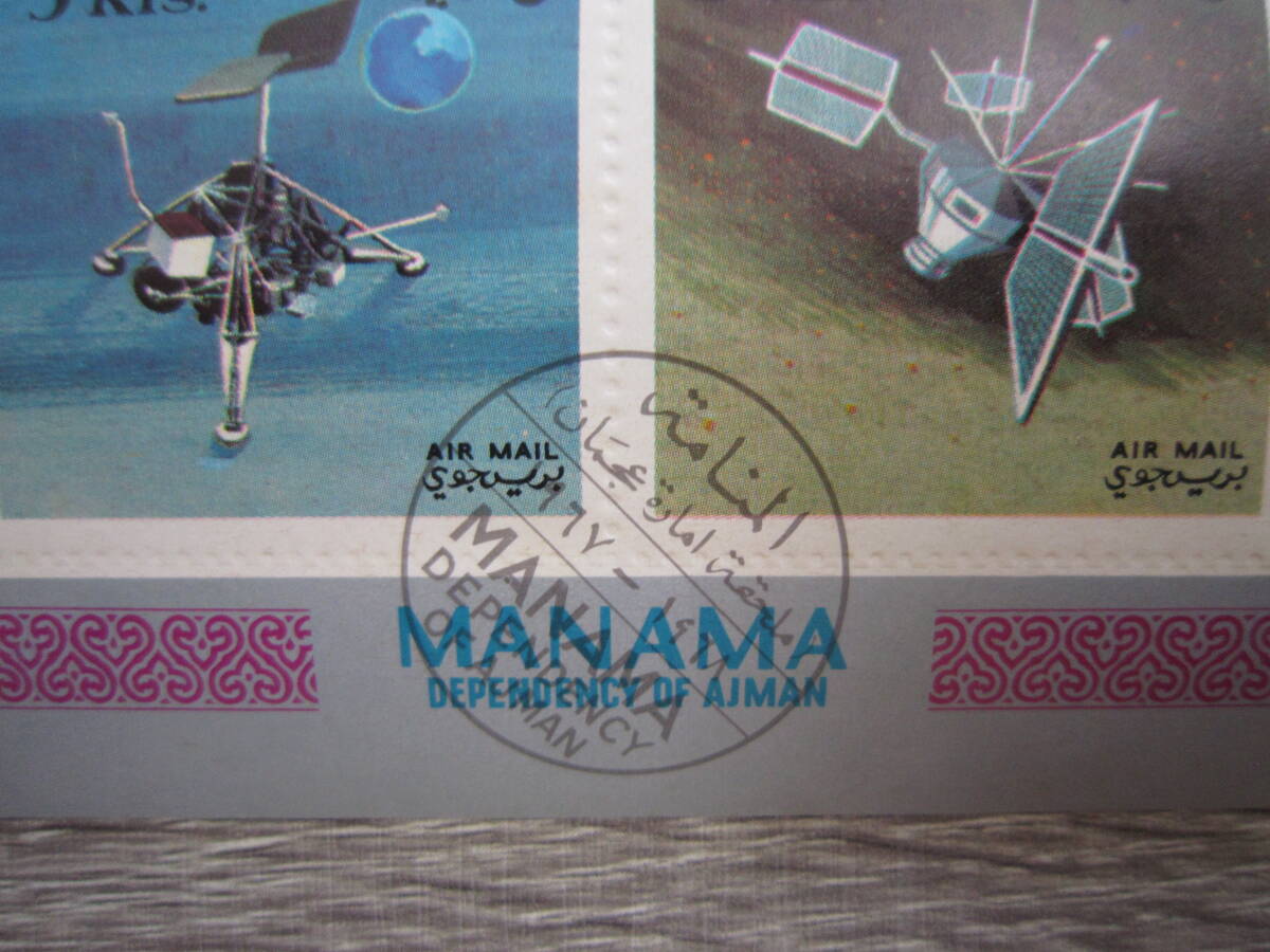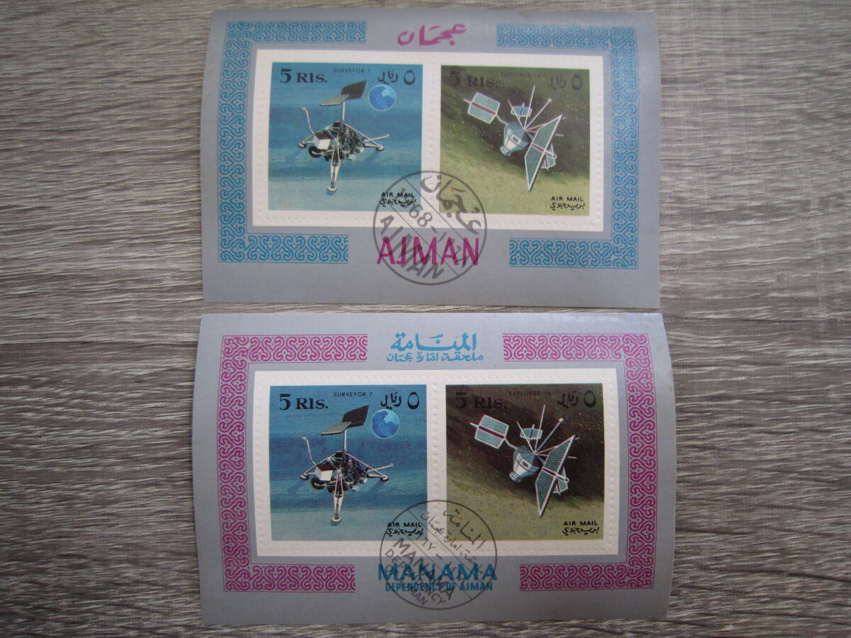 (小型シート/消印有/目打ち有/裏面シミ有) 記念切手2枚セット AJMAN アジュマーン マナマ SURVEYOR サーベイヤー計画 宇宙船 1968年 郵趣