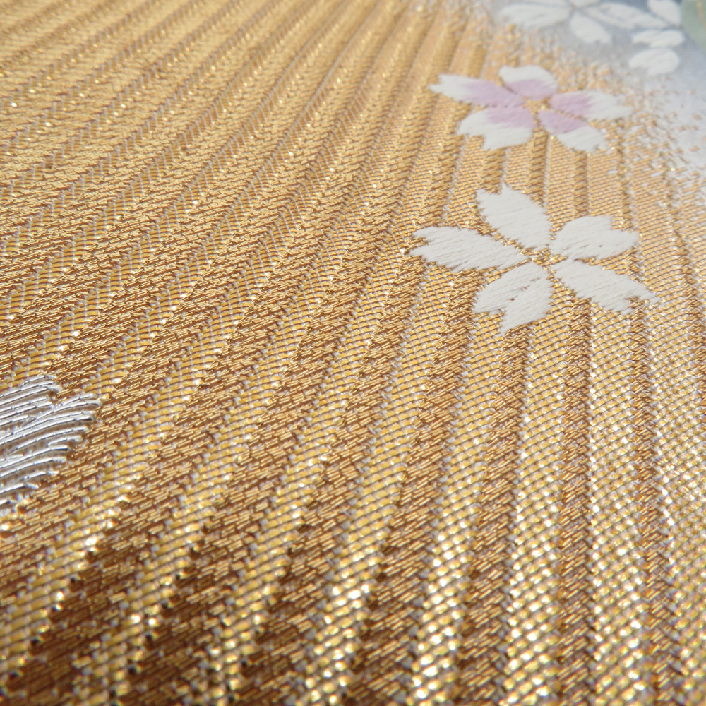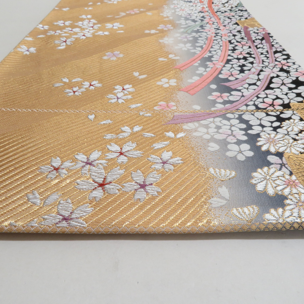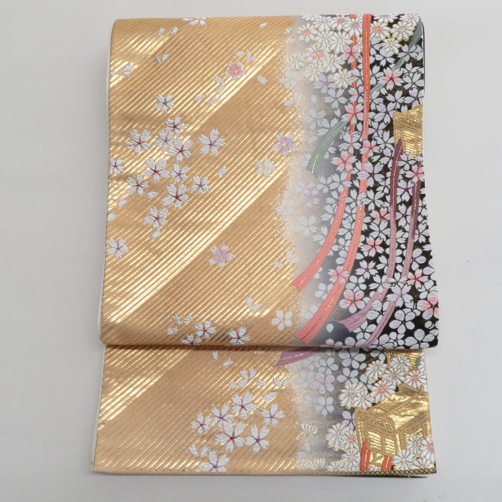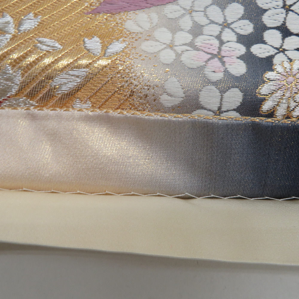 | 袋帯 振袖用 金色x灰色 御所車に小桜文様 六通柄 正絹 仕立て上がり 着物帯 長さ424cm |