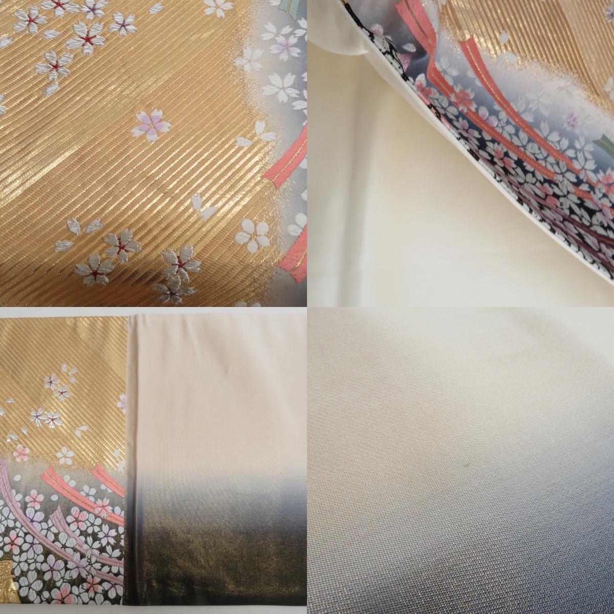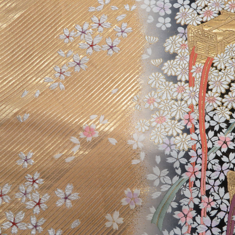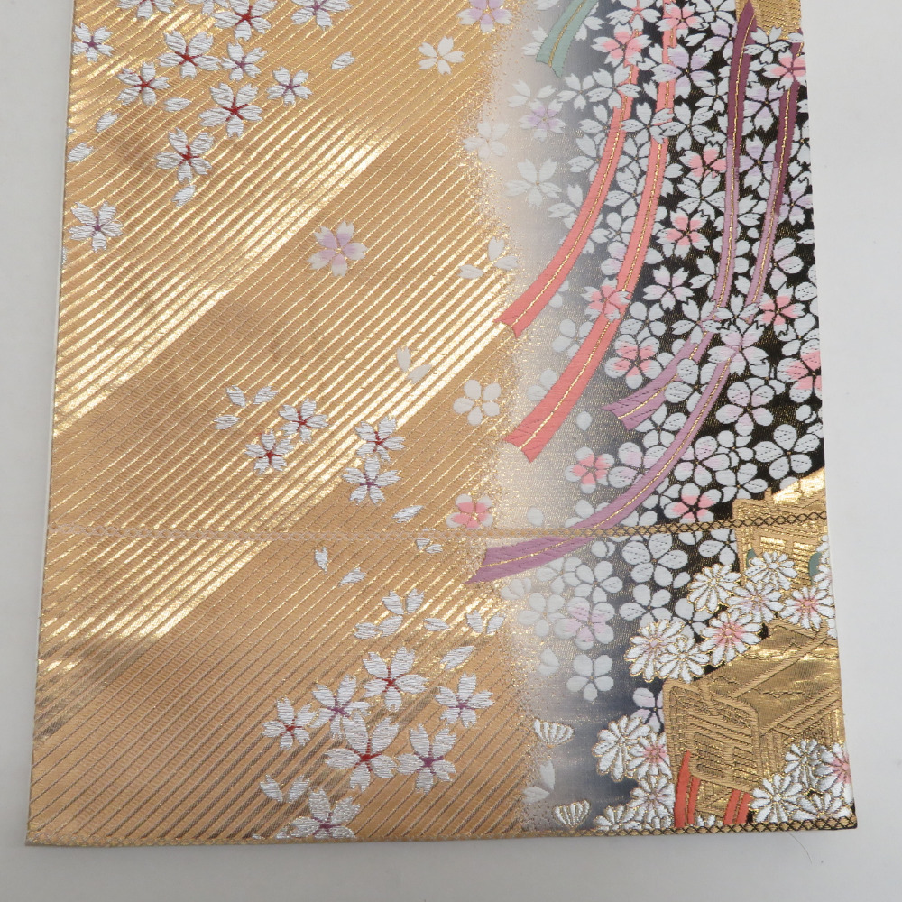 | 袋帯 振袖用 金色x灰色 御所車に小桜文様 六通柄 正絹 仕立て上がり 着物帯 長さ424cm |
