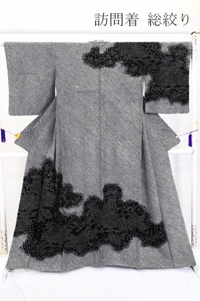 黒地に枝花があしらわれた総絞りの訪問着です。 モノトーンの色合いと、絞りならではのふんわりとした風合いが素敵な一枚です。 担当:伊藤 |