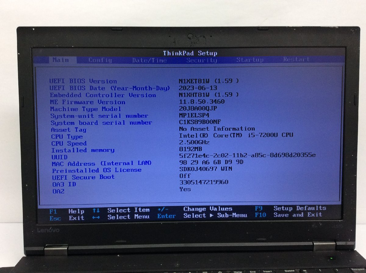 ジャンク/ LENOVO 20J8A00QJP ThinkPad L570 Intel Core i5-7200U メモリ8.19GB ストレージ無し 【K23489】
