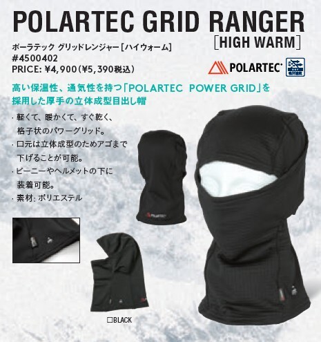 高い保温性、通気性を持つ「POLARTEC POWER GRID」を採用した厚手の立体成型目出し帽