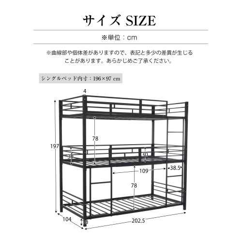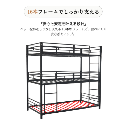 • 【省スペースな垂直はしご、左右前後自由に変更】3段ベッドはスペースを最大限に節約し、広くない家庭や学生・社員寮などでの使用に最適です。省スペースな垂直はしごも、斜めに置いたはしごに比べて場所を取らず、余分なスペースを削減します。はしごは、部屋のレイアウトに応じて自由に変更でき、左右や前後に置くことができます。