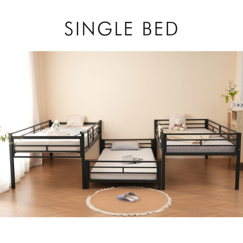 • 【柔軟性と多機能性、配置の自由度】3段ベッドは上下に分割でき、3つのシングルベッドとしても使用可能。子供の成長に伴いお部屋を別々にする際も、そのまま3つのベッドとして利用できるため、便利な家具として長く使えます。柔軟性があり、将来のニーズに適応し、家族構成の変化に対応できるため、多くの家庭で重宝されています。ベッドが分割可能なため、部屋のレイアウトを自由に変更でき、スペースを有効活用できることで、部屋の使い勝手が向上します。