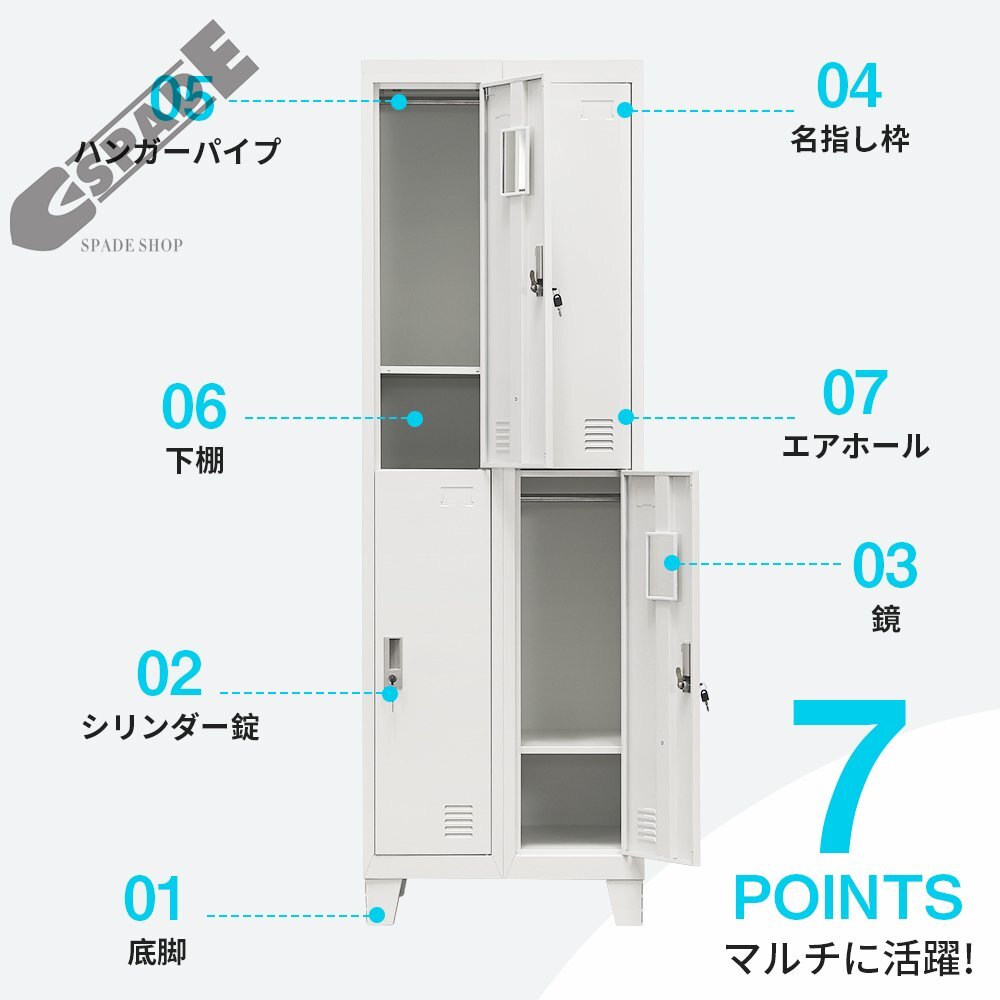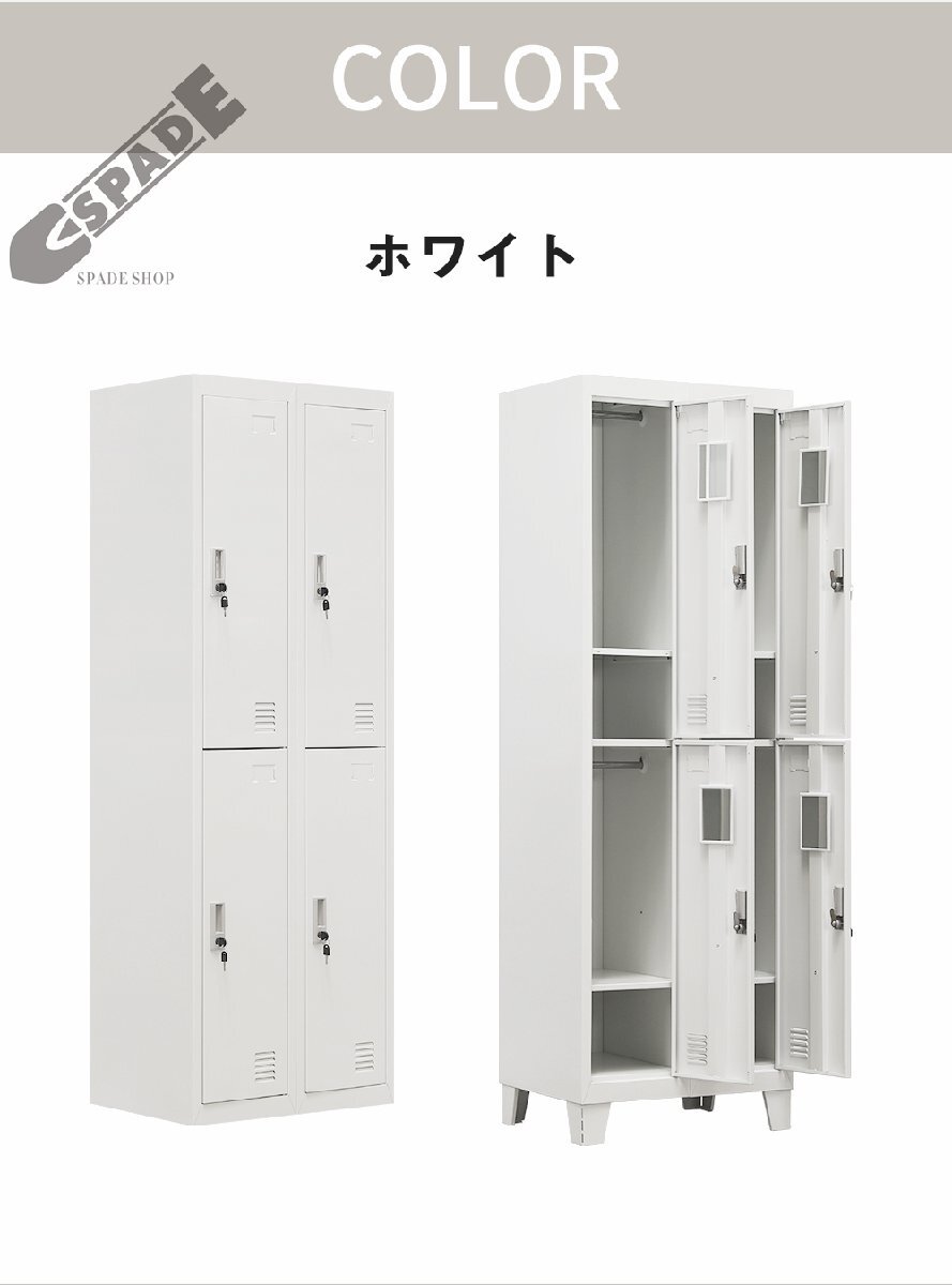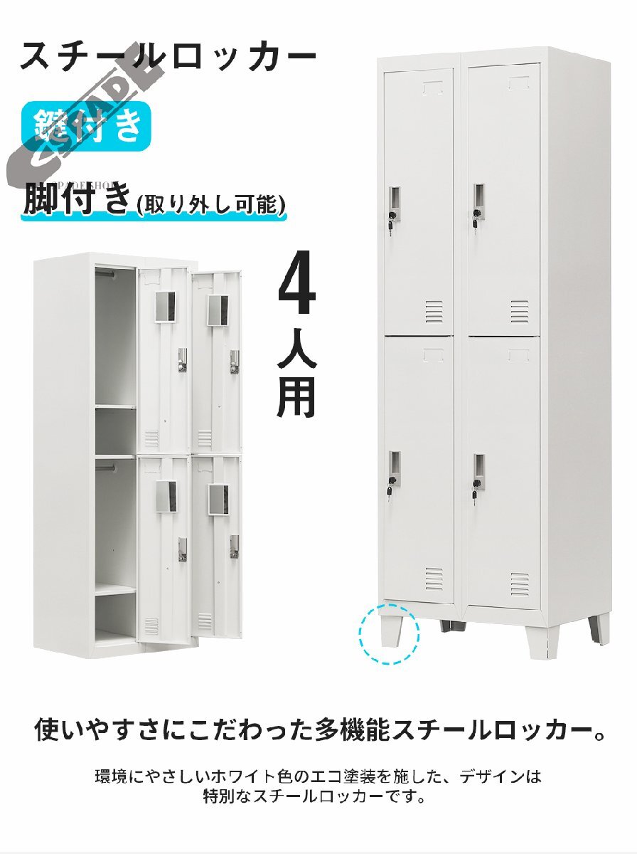 【国内発送】ロッカー スチールロッカー オフィスロッカー 脚付き 4人用 ホワイト 鍵付き シリンダー錠 スペアキー付