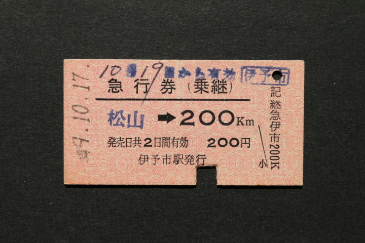 急行券(乗継) 松山→ 200㎞ 200円 伊予市駅発行