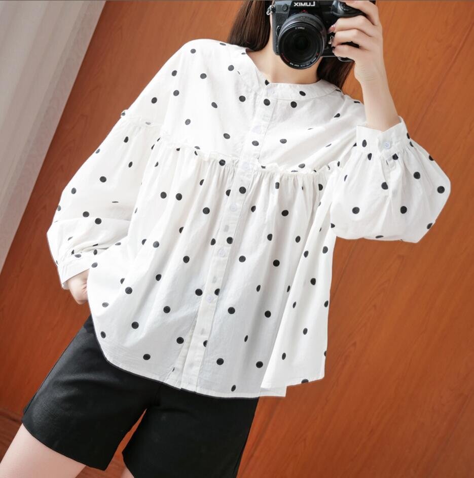 春新作 カジュアル シャツ 水玉柄 可愛い 大人 ブラウス 通勤通学 長袖 トップス シンプル チュニック ★XLサイズ