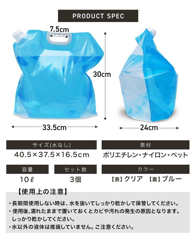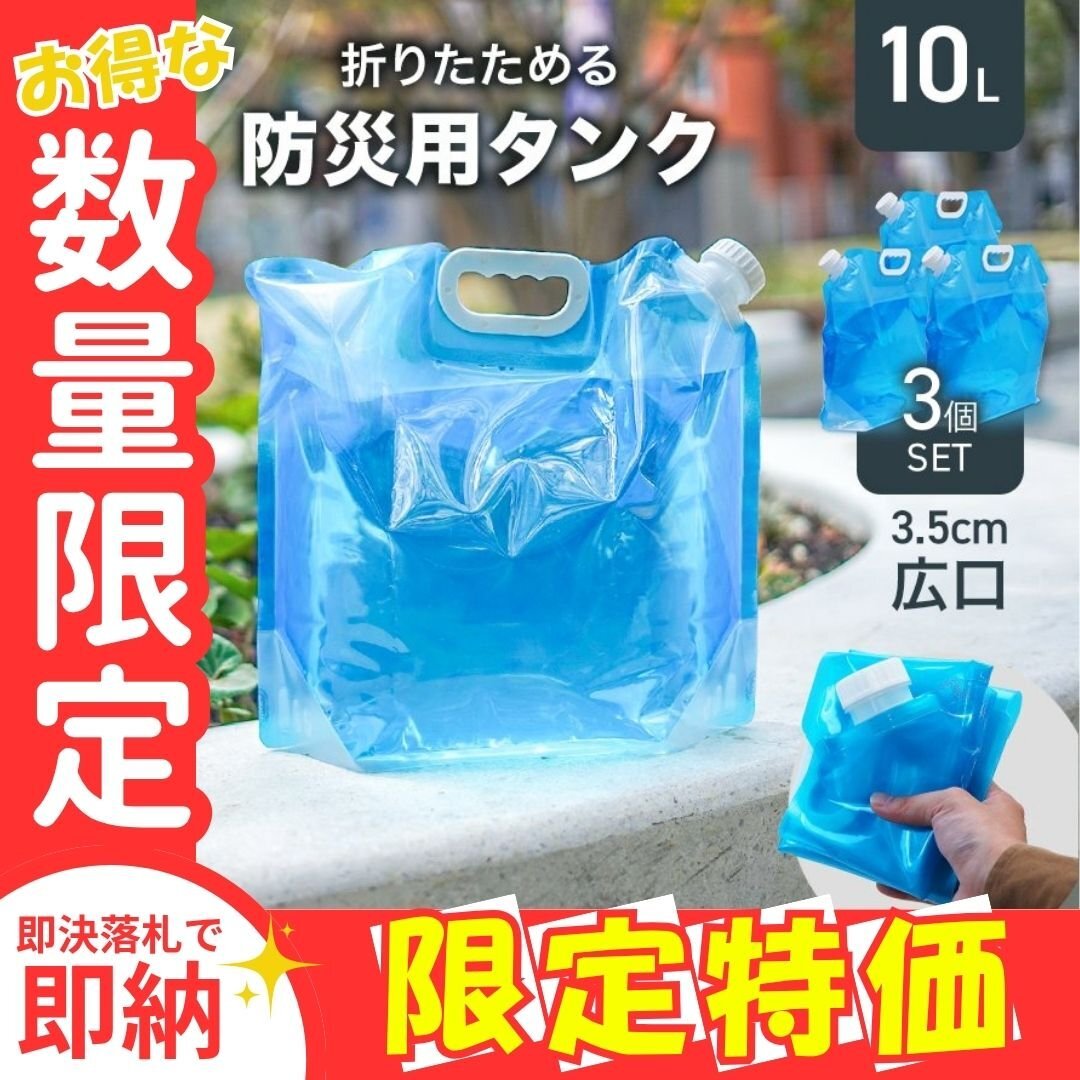 \アウトドアから非常時の備え用に!/ 折り畳めるマチ付きウォータータンク 10L×3個セット 災害時・アウトドア・レジャーなど様々なシーンで大活躍! ■安心の大容量 給水所での水の確保に最適な大容量10L! 複数使いで水の使い分けも可能です。 ■丈夫な3層構造 しっかりした3層構造で耐久性抜群!繰り返しの使用も安心。 ■折りたたみ可能 小さく畳んでコンパクト収納、持ち運びもラクラク♪ ■注ぎやすい広口設計 開口部約3.5cmと広いので水を注ぎやすく、こぼれにくい。 水の補充や中の洗浄も簡単! ■疲れにくい持ち手 持ちやすく握りやすいハンドル形状なので、 指にフィットして長時間でも疲れにくい設計です。 ■マチ付き&自立可能 地面に置いてもしっかり自立!注ぎ作業も安定してできます。 ■残量が見えやすい半透明 外から中身の確認ができるため、補充のタイミングがわかりやすい◎ 【使用シーンいろいろ】 ・防災グッズとして非常用の備えに ・キャンプ、登山などアウトドアに ・スポーツや運動会などの給水に ・ガーデニング、洗車用の水確保にも 【商品コード】HGB0210BL 【商品詳細】 3個セット 容量:10L ※ひとつあたり カラー: 表:クリア 裏面:ブルー サイズ(約):40.5×37.5×16.5cm 素材:ポリエチレン、ナイロン、ペット 【注意事項】 ・長時間使用しない時は、水を抜いてしっかり乾かしてください。 ・使用後、濡れたままで置いておくとカビや汚れの原因になります。しっかり乾かしてください。 ・水以外の液体は推奨していません。ご注意ください。 ・商品は、モニターによって色合いが異なって見える場合があります。 ・仕様・デザインは改良のため予告なく変更することがあります。 【もちろん新品未使用品です】 |
