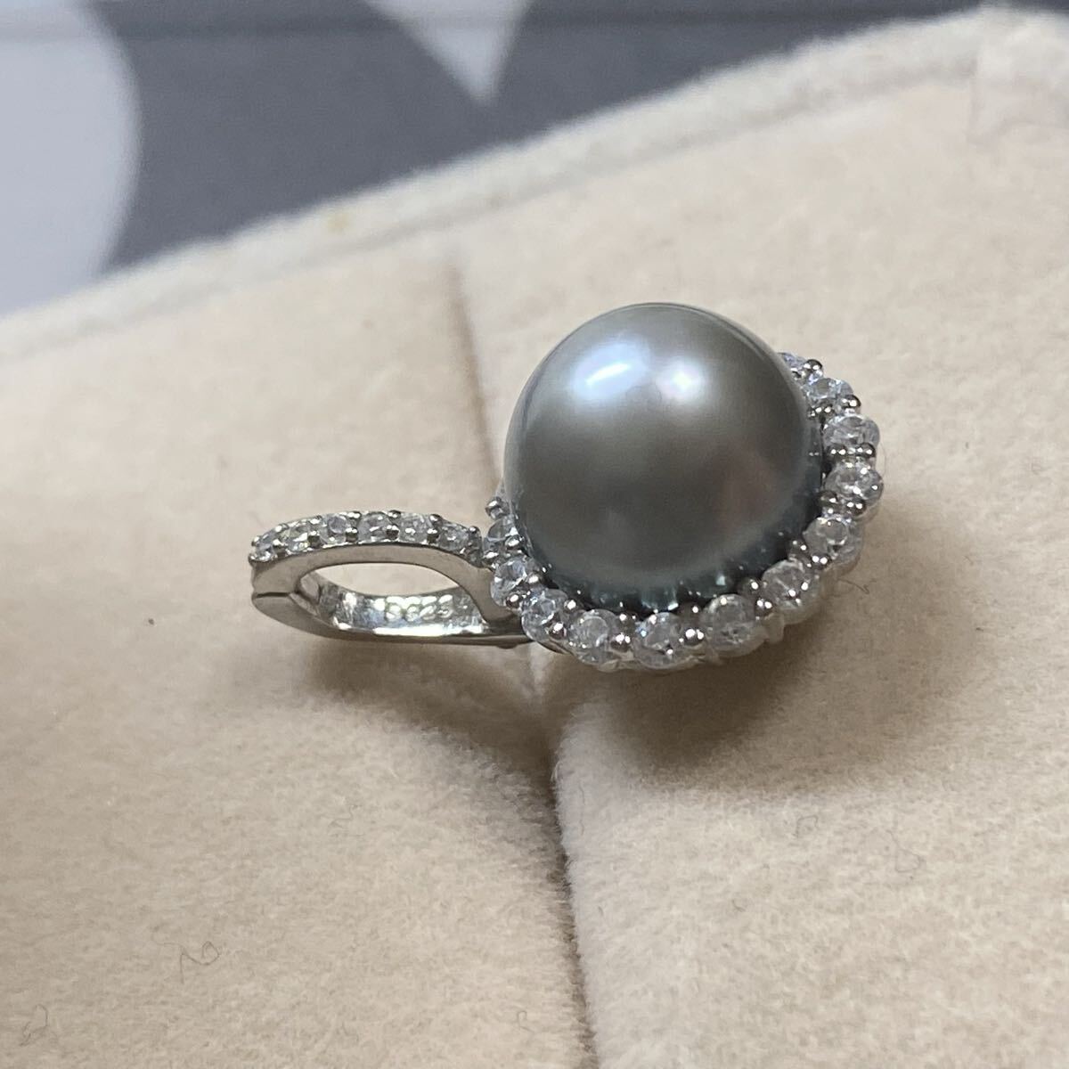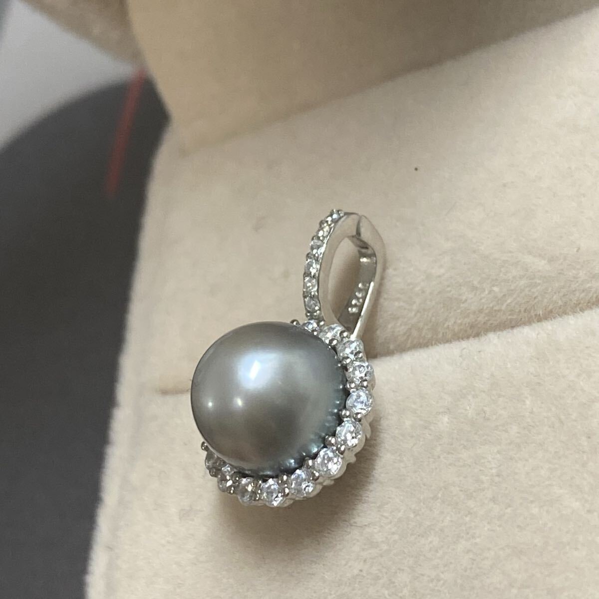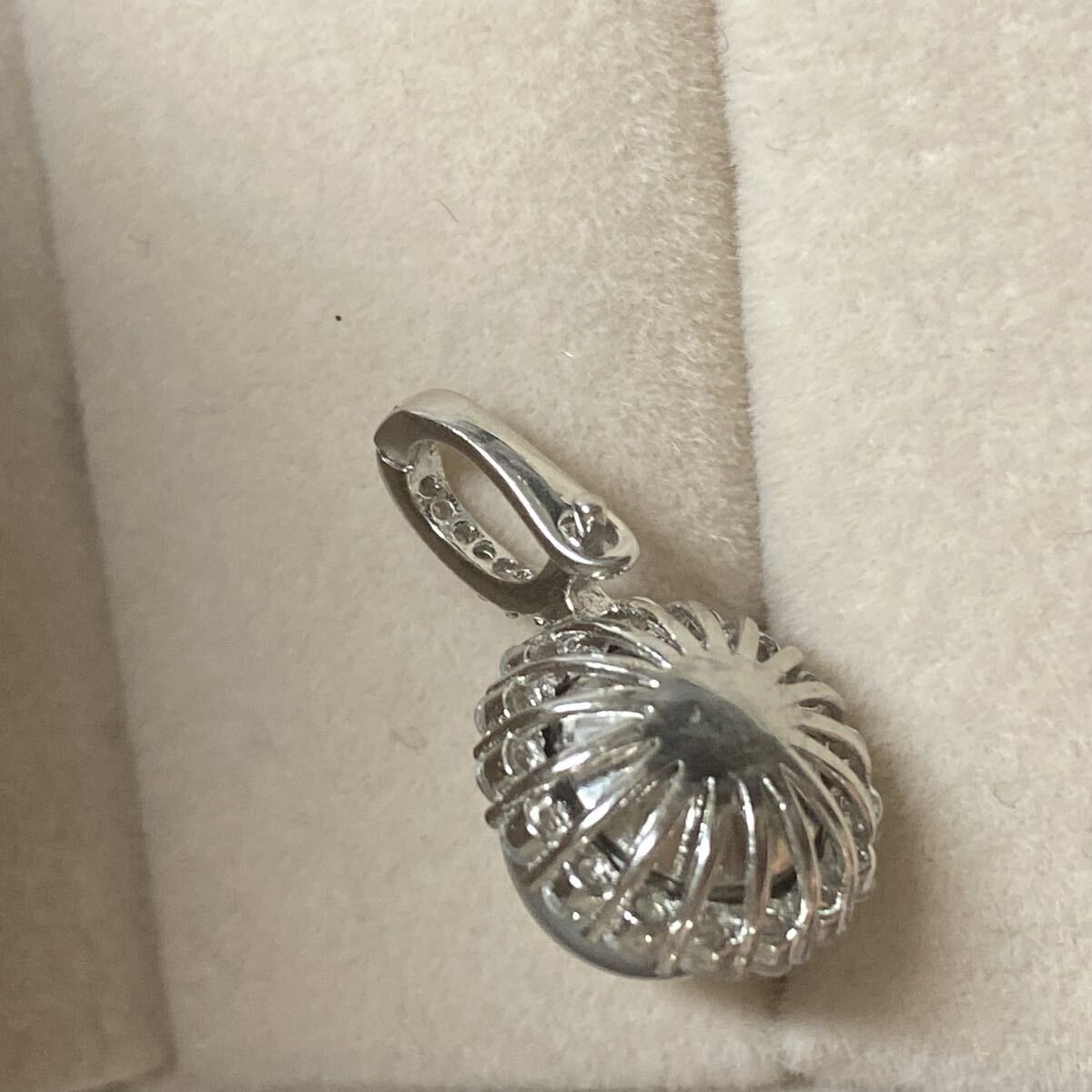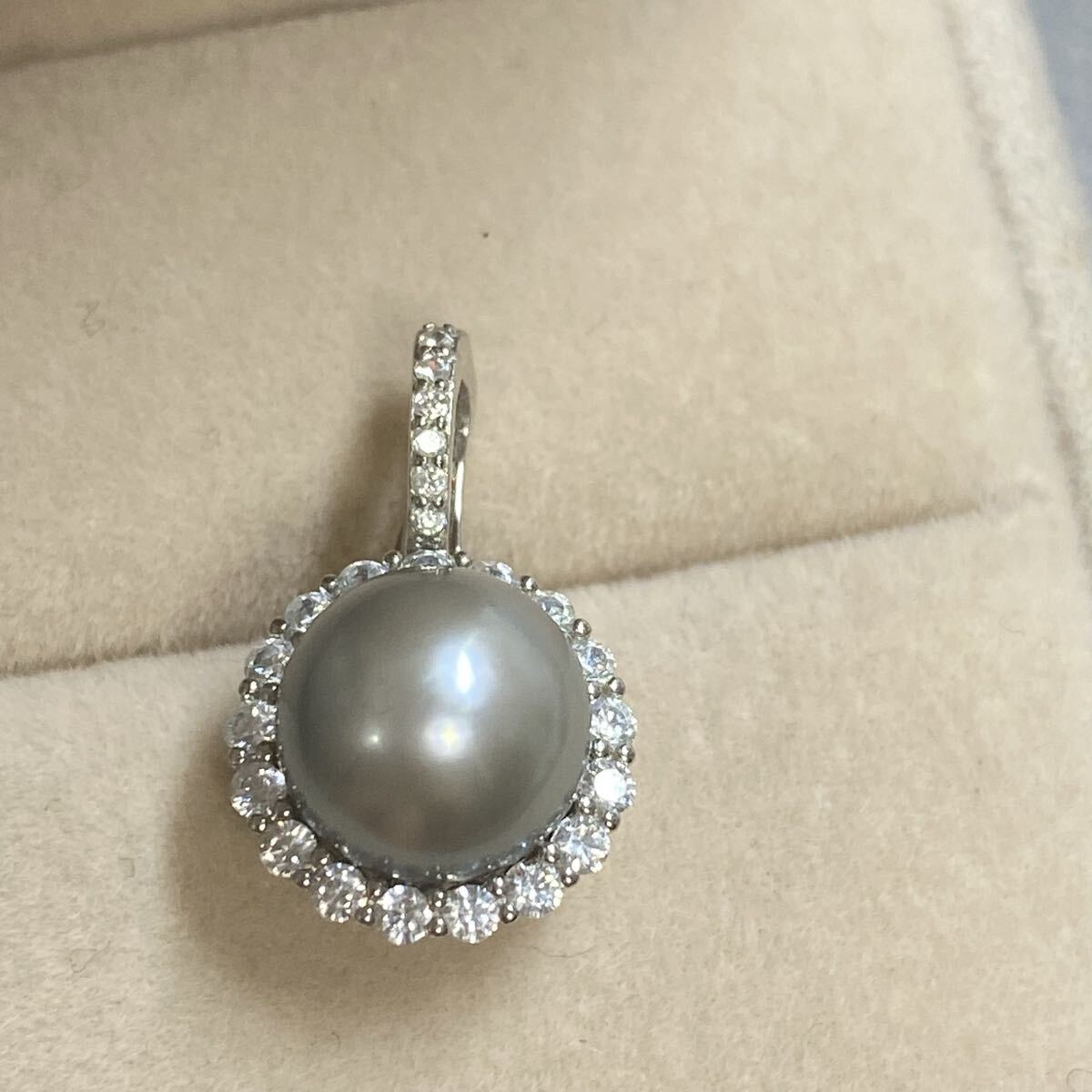 グレーのパールが美しいペンダントトップです。周囲にはジルコニアがあしらわれ、上品な輝きを放ちます。素材はシルバー925です。