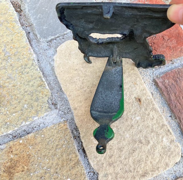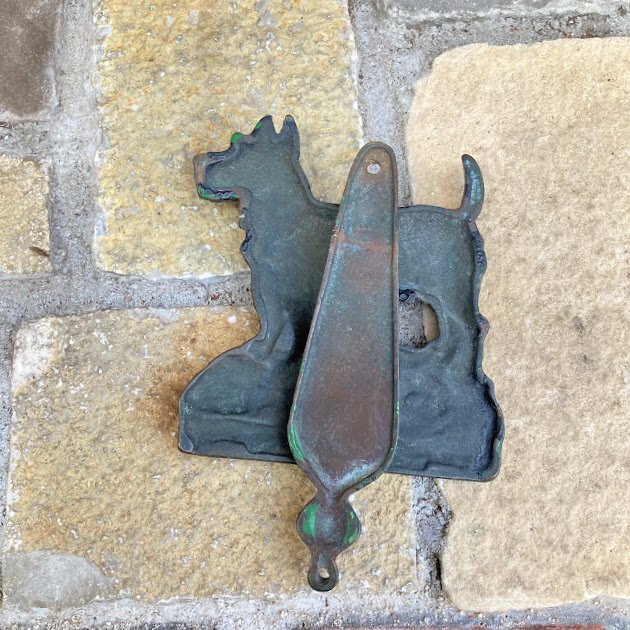 スコティッシュテリアのドアノッカー。推定1940年代頃とのこと。コツコツと可愛らしい音が響きます。下に刻んであるABERDEEN TERRIER とはスコットランドゲール語でスコティッシュテリアの事を指すそうです。長きに渡り動物と共に過ごすイギリスらしい商品ですね。上下2か所に取り付けるための穴が開いています。当時のままの雰囲気残したいため、ピカピカにはせず乾拭きのみ行っております。表面には黒い塗装が剥がれた跡、裏面に1か所1mm程度のカケと、固定する部分に緑のペンキが残されていました。何でも自分たちでDIYしてしまう英国らしいたたずまいです。大好きなワンちゃんの面影を感じる方、店舗などでちょっとしたアクセントが欲しい方におすすめ。ピカピカの新品をお求めの方はご遠慮ください。福岡市南区の店舗にてお渡しもできますのでお気軽にどうぞ!