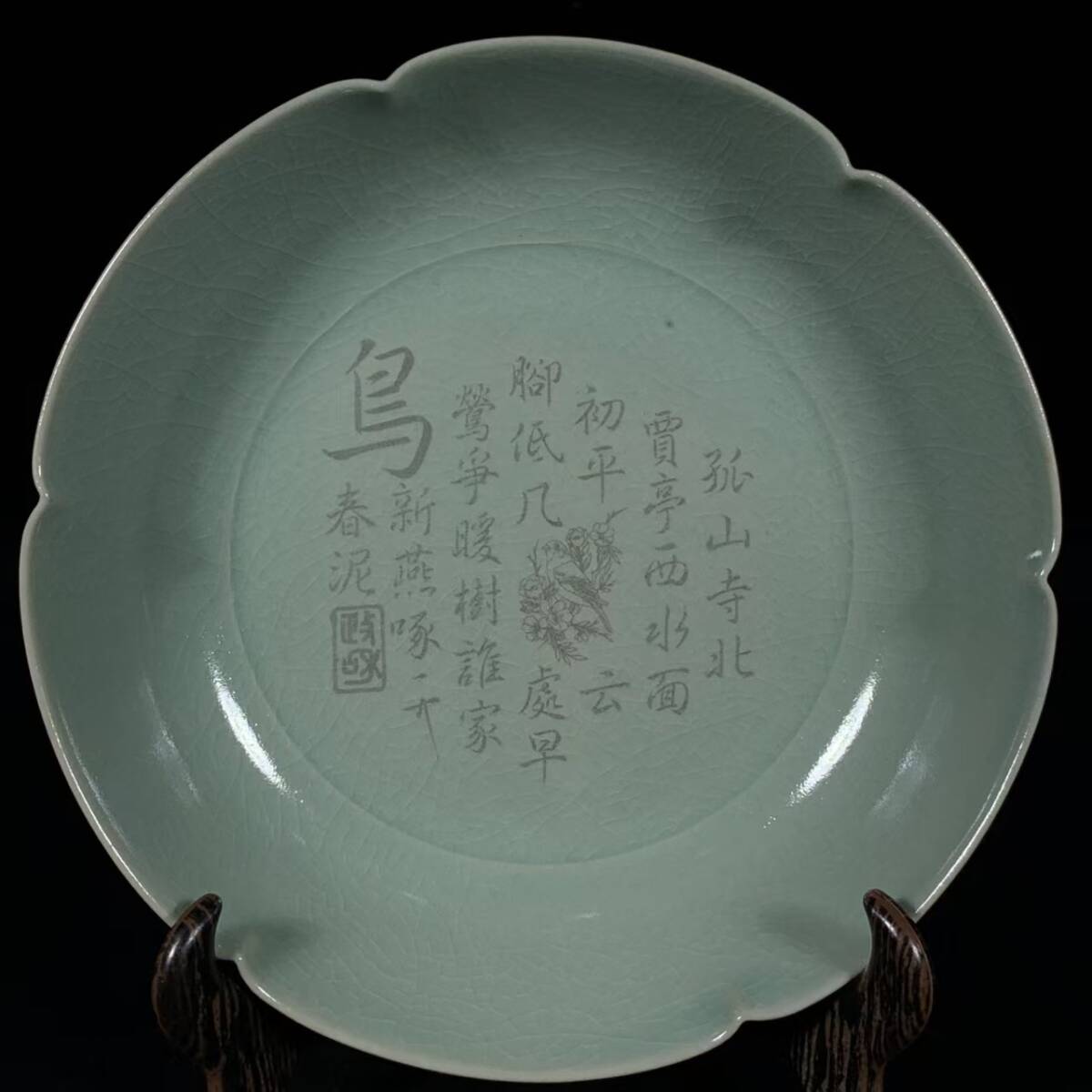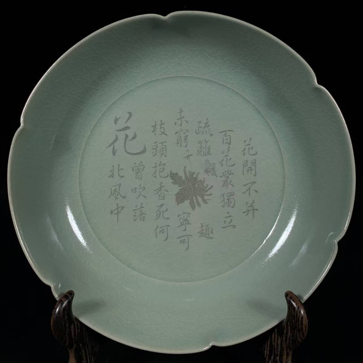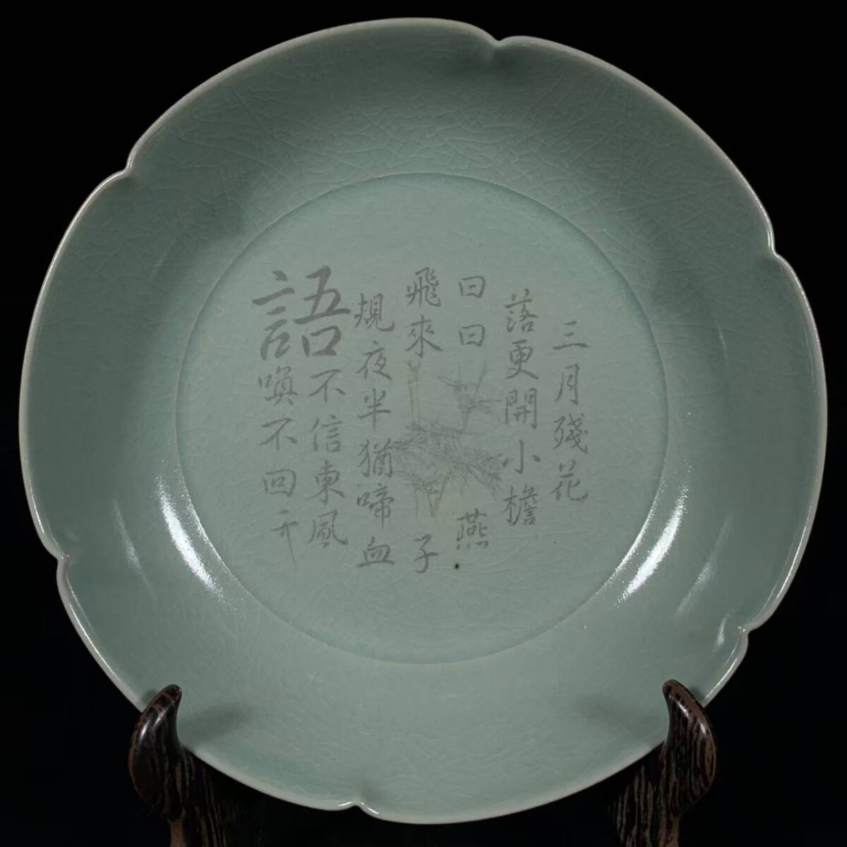 宋時代 官窯 汝窯 天青釉 銘文彫鳥語花香葵口皿 盤 古陶磁器 陶芸 秘蔵 唐物 古賞物 時代物 骨董品 旧家蔵出 東洋彫刻 古美術品古置物 1123