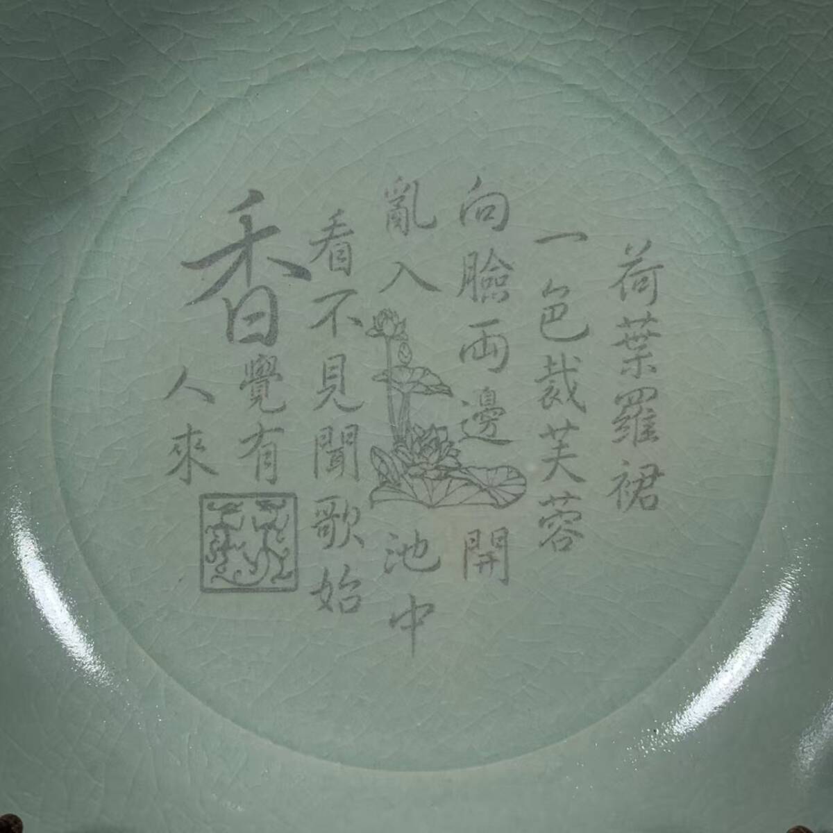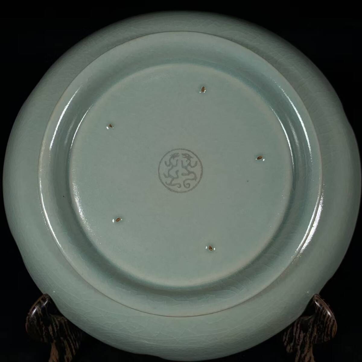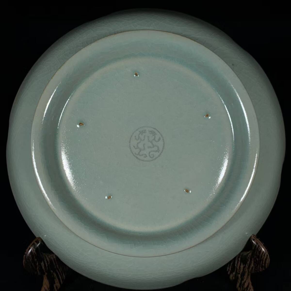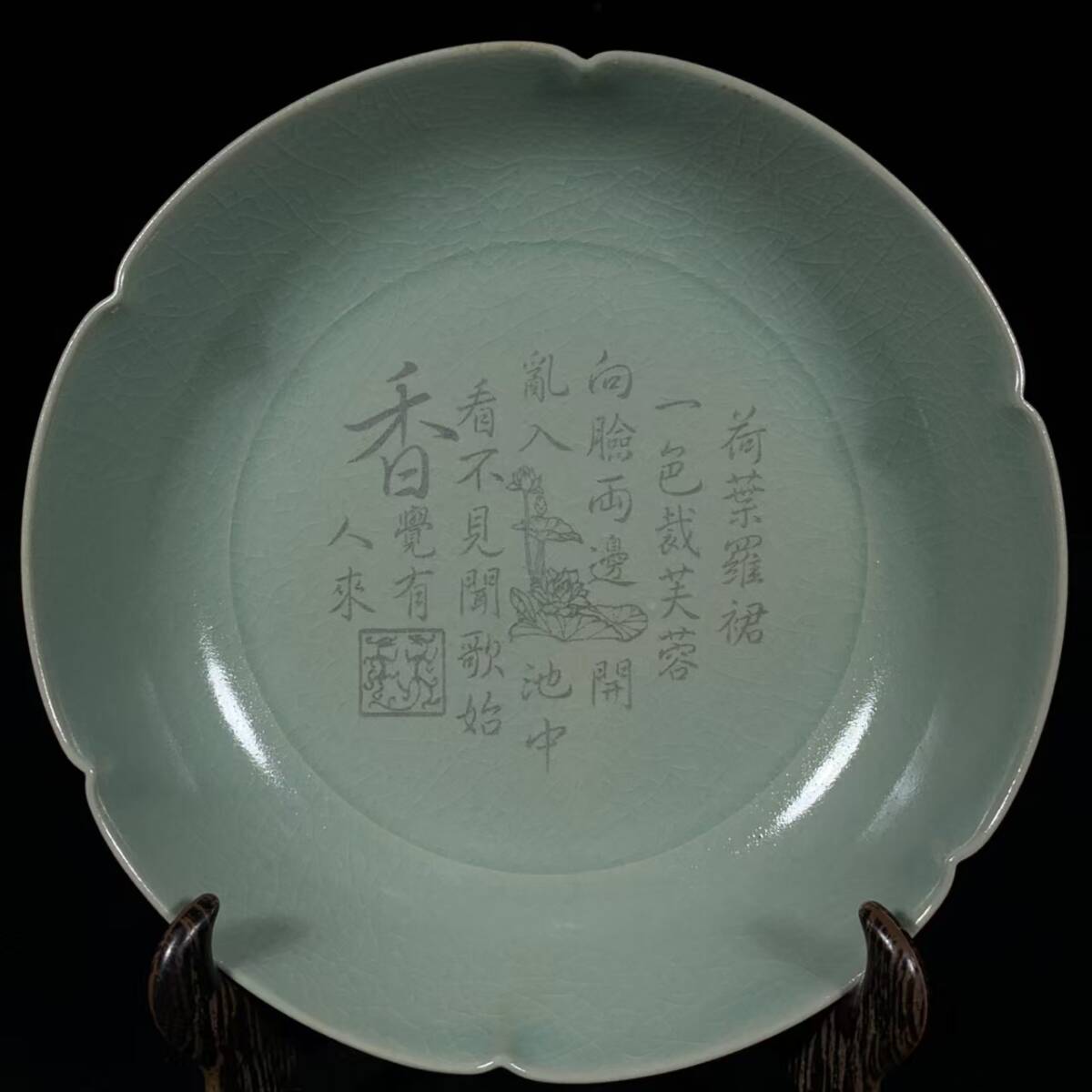宋時代 官窯 汝窯 天青釉 銘文彫鳥語花香葵口皿 盤 古陶磁器 陶芸 秘蔵 唐物 古賞物 時代物 骨董品 旧家蔵出 東洋彫刻 古美術品古置物 1123