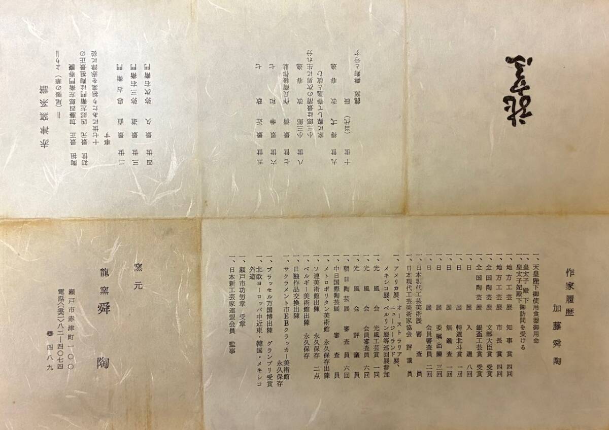 1991年 第23回日展内閣総理大臣賞受賞、瀬戸市指定無形文化財(陶芸灰釉技法)保持者認定。