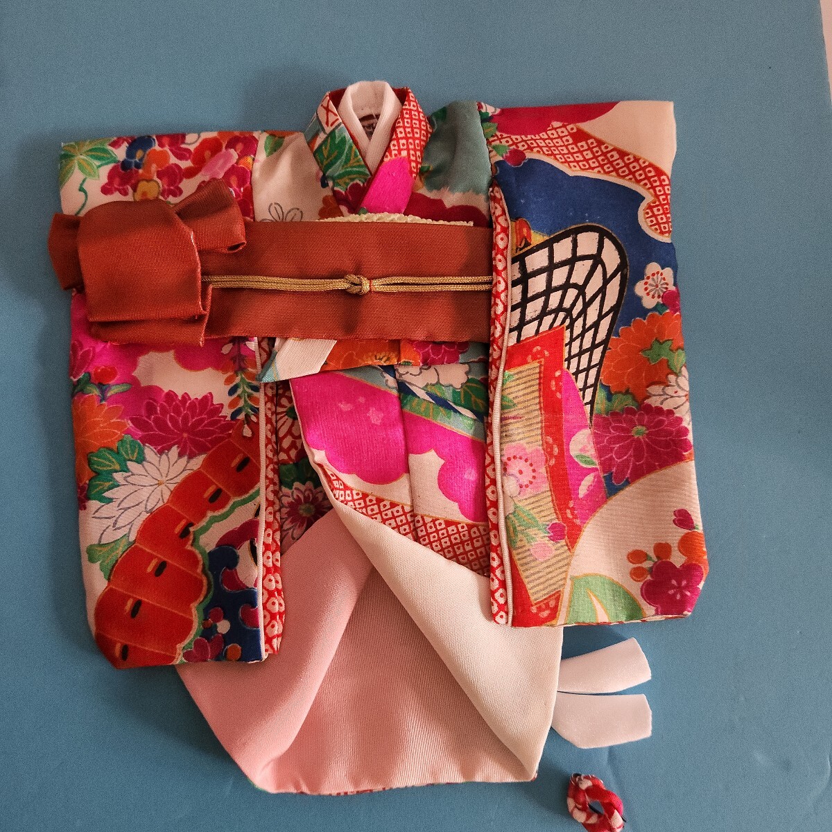 ーちゃんの着物を私が手縫いで仕立てました。モデルのドールは商品には含まれません。