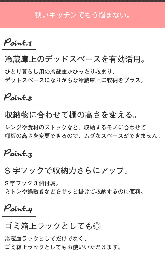 冷蔵庫上のデッドスペースに収納場所を確保し、無駄のないキッチンスペースを。