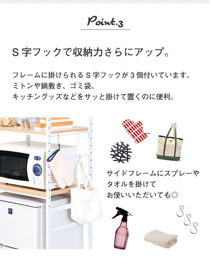 レジ袋収納やミトンなどを引っ掛けて収納するのに便利なS字フック3個付き。