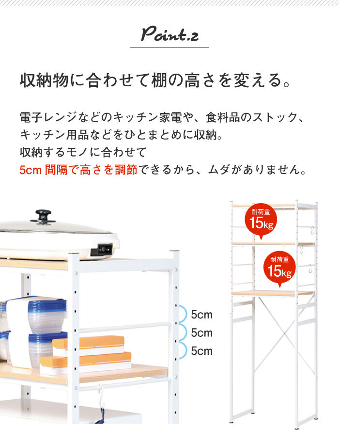 収納するモノに合わせて棚板の高さを5cmピッチで調節できます。