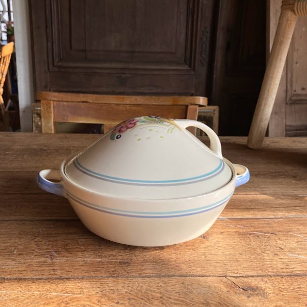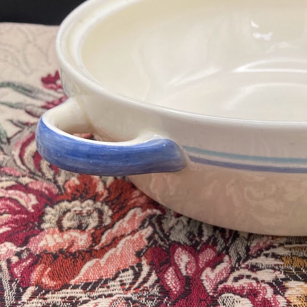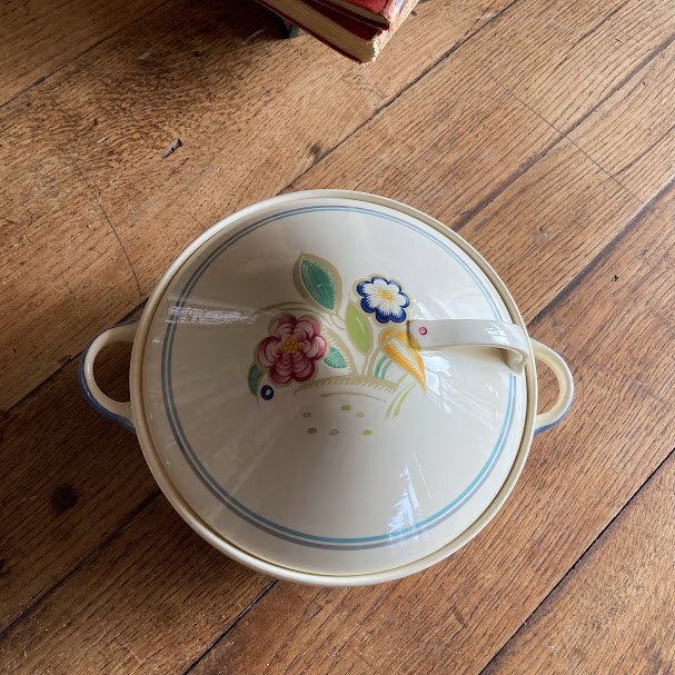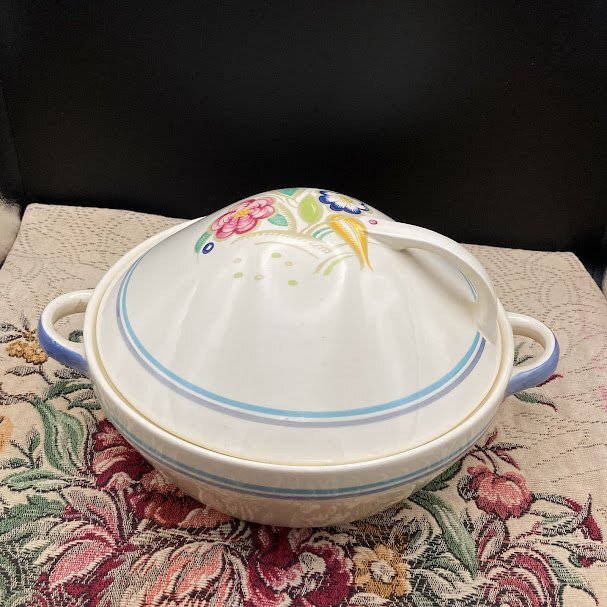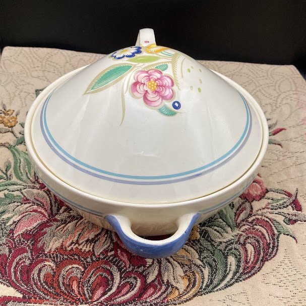 このチュリーンはスージ―の全盛期にクラウンワークス製陶器工場でデザインされた「Nosegay」香りの花束という意味でアールデコ調の花柄が特徴です【43-318A】この当時(1932年)イギリス王室のメアリー王妃がスージーの食器を一目見て気に入り王室用の食器として購入したという素敵な逸話もあるようです。蓋は裏返して深めのボウルとして使用することもできる優れもの。裏返すことで、収納もしやすくなりとても便利ですよ。オリジナルの使い方をお楽しみください。福岡市南区の店舗にてお渡しもできますのでお気軽にどうぞ!