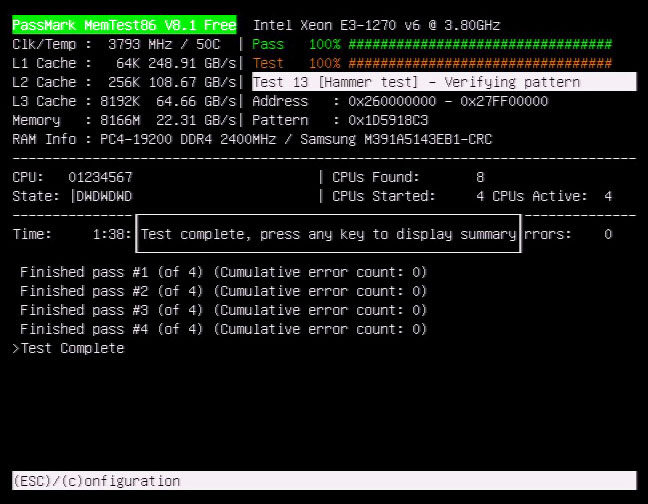 念のため Memtest86(デフォルト設定)を実行し、ノーエラーで完走しました。