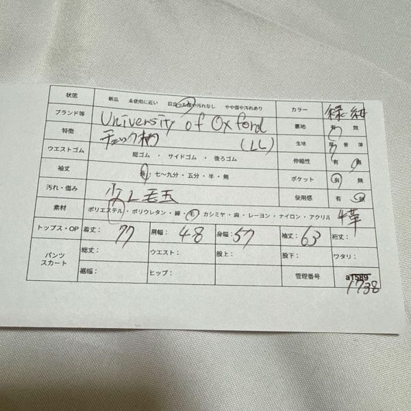 英国風チェック柄♪University of Oxford ウールジャケット - ブランド:University of Oxford(ユニバーシティ オブ オックスフォード) - アイテム:チェック柄ジャケット - サイズ表記:LL - カラー:ネイビー×グリーン(チェック柄) - 素材:表地 毛 ポリエステル 牛革 - 特徴:英国調のトラディショナルなチェック柄が印象的なウールジャケット。 上質なウール素材で、ほどよい厚みと暖かさがあり、秋冬にぴったりの一着です。 スタンドカラーにレザーの留め具がアクセントになったおしゃれなデザイン。 裏地付きで着心地も滑らか。 - ダメージ・汚れ詳細:わずかに毛玉あり 管理番号:a1738 即購入大歓迎・お得な割引各種あります 詳しくはプロフィールをご覧ください! 匿名&送料無料 海外輸入のため全て一点ものです 古着のため使用感・毛玉等があることもあります。写真で状態の確認を行なってからご購入ください おまとめ買いでお得な割引あります♪ 平置き採寸表→写真から確認いただけます! (素人採寸のため、多少の誤差はご了承ください) 商品状態に関しては、写真、商品説明欄に記載しております。着用回数、購入時期などはお答えできませんので、ご了承ください。着画、写真の追加もお断りしております。 簡易包装のコンパクト発送となります。 畳みシワはご了承の程、宜しくお願いいたします。 商品によっては圧縮してお送りするものもございます。 撮影環境や使用するモニター、反映されにくい色味など、 商品と画像に若干の色誤差が生じますことをご了承ください。 出品作業の際にしっかりと確認はしておりますが、シミなどの見落としがある場合もございますのでご了承下さい。 古着の取り扱いになりますので特有の匂い等がある可能性があります。ご理解のある方のみご購入の程お願い致します。