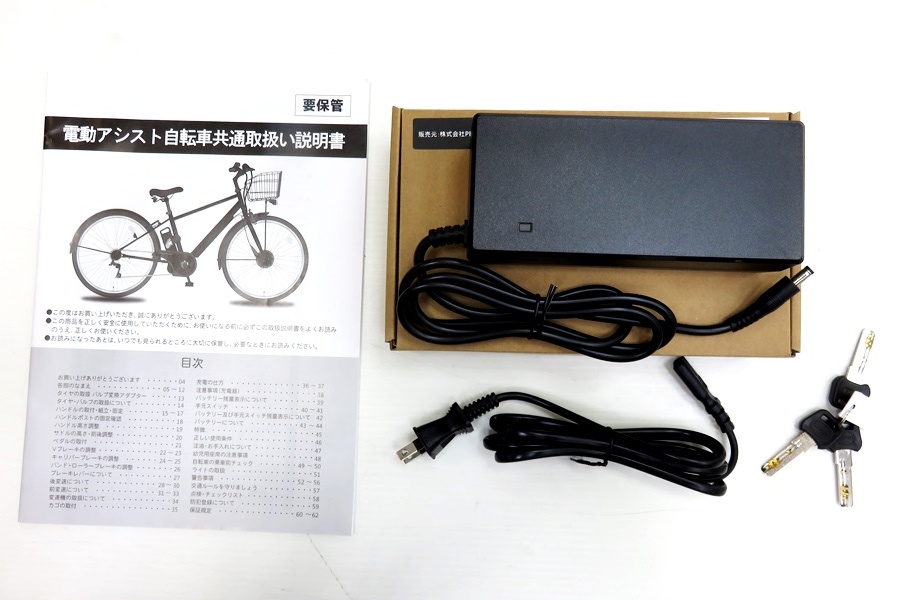 付属品は充電器、バッテリーキー×3、自転車キー×2、ペダル、取説です。