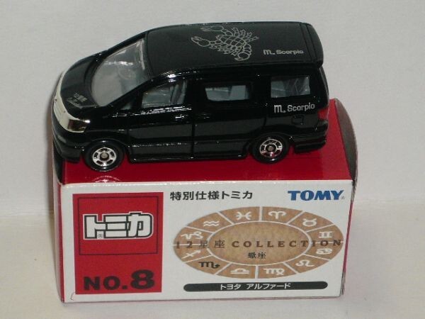 特別仕様トミカ 12星座COLLECTION No.8 トヨタ アルファード 黒です。箱に少し傷みがありますので、ご了承の上入札下さい。商品の状況は写真でご判断の上、ノ-クレ-ム・ノ-リタ-ンでお願いします。保証はできませんが、定形外郵便での発送も可能です。