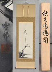 64◆初荷です ◆掛軸 中山雪邨 枯木鳴鵙図 絹本 真作 ◆保存箱 師は村瀬桃岡 宮本武蔵