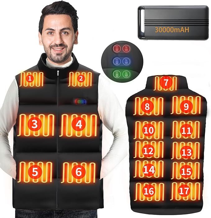 電熱ベスト ヒーターベスト ブラック XL 17箇所発熱 30000mAhバッテリー付き 3段階調温 ダウンベスト 男女兼用 丸洗い 節電 省エネ