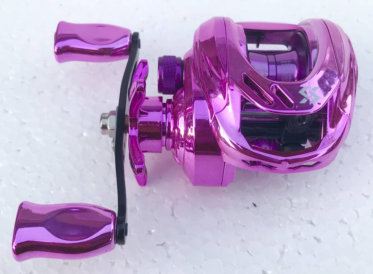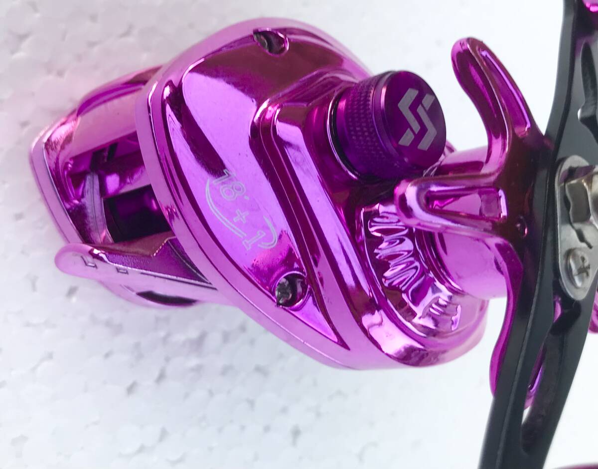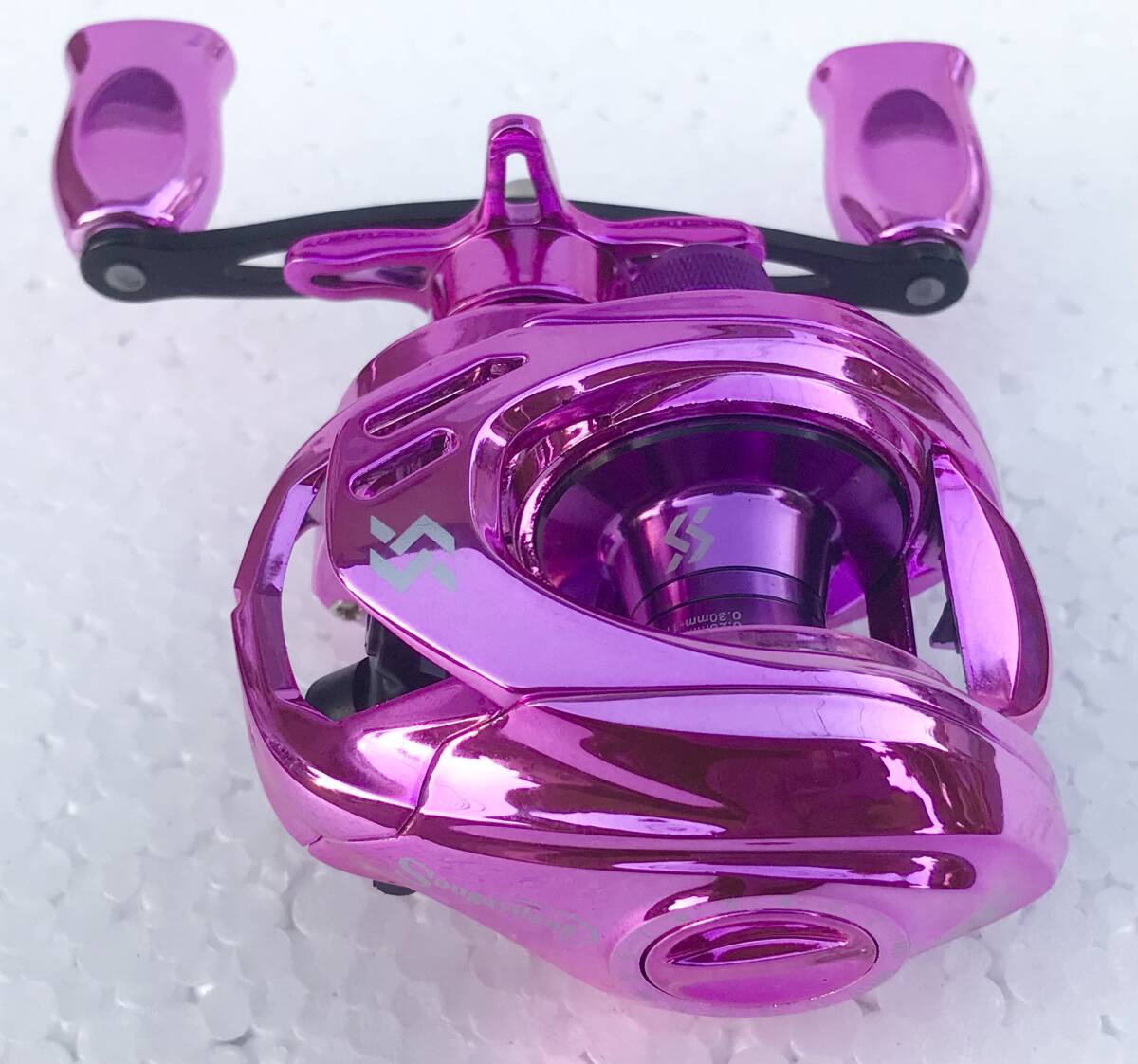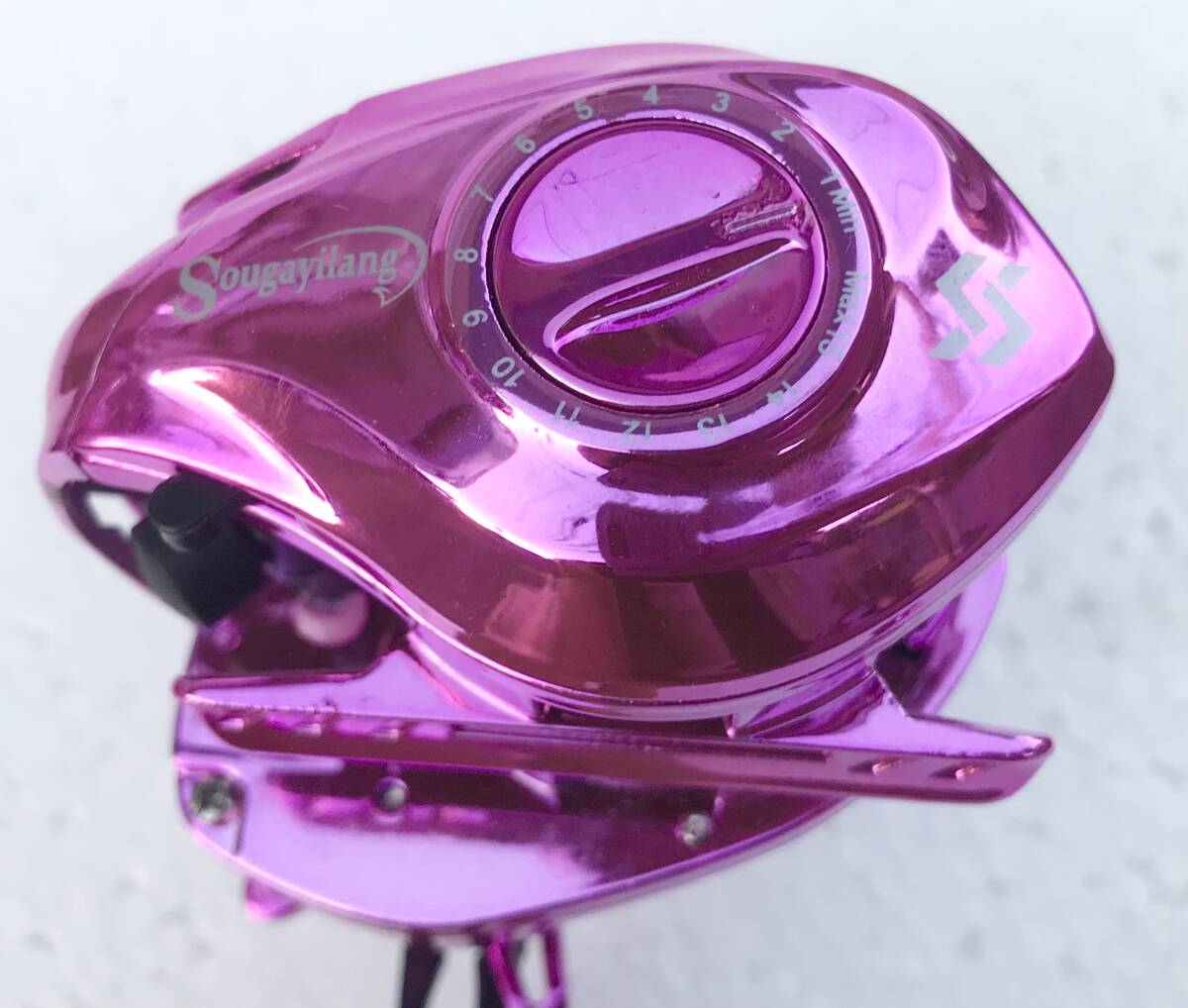 写真のSOUGAYILANGベイトキャスティングリール スペシャルカラークロームピンクメタリック右ハンドル(新品未使用)を発送します(送料無料)。