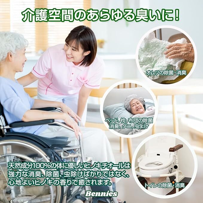 雑菌から出る悪臭を防ぐ効果もあり、介護用おむつやトイレの防臭として、介護現場でも利用されています。