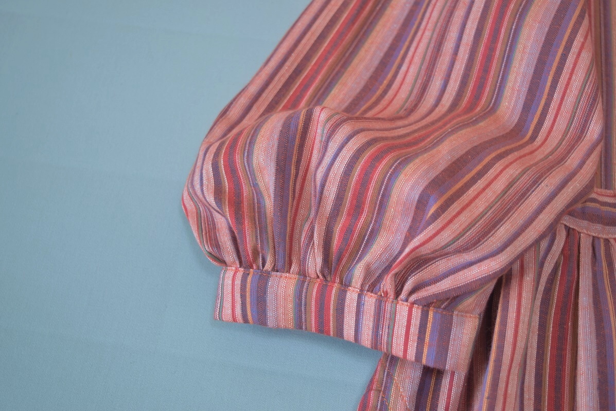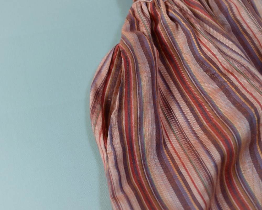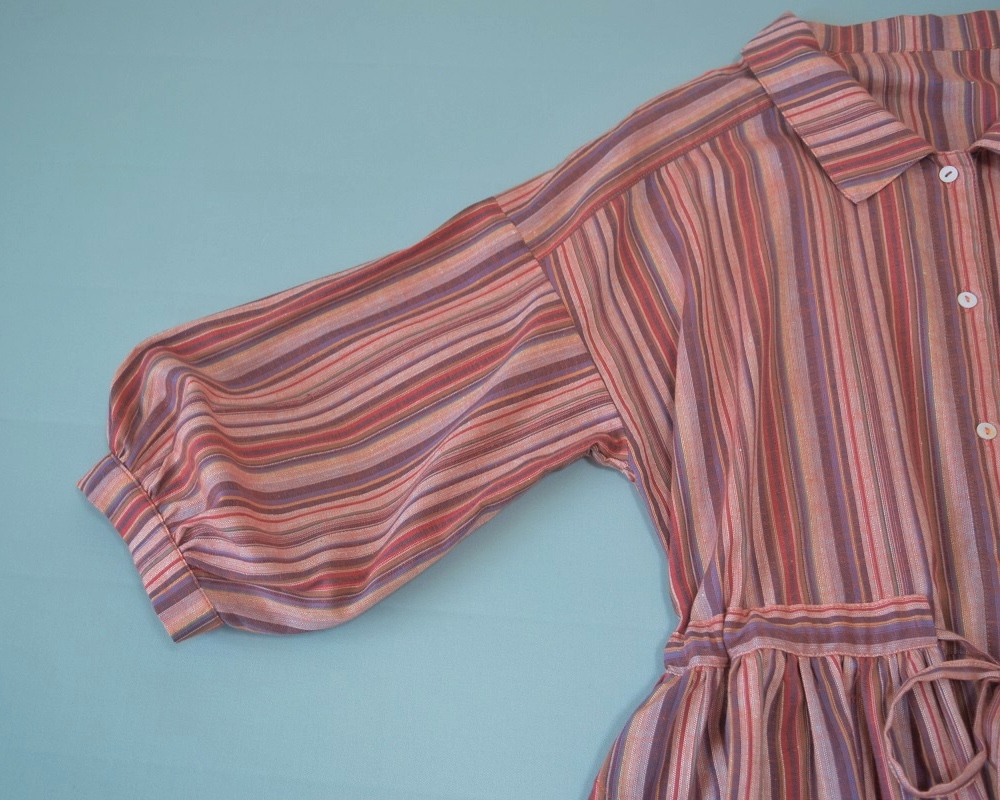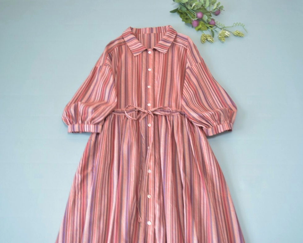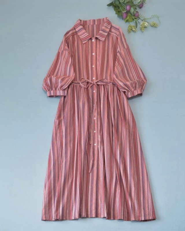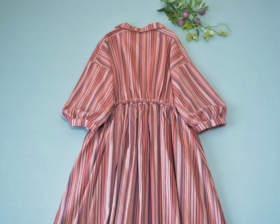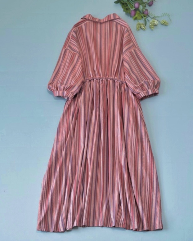 コットン100%ポケット付きストライプ紐でギャザー寄せ大人可愛い七分袖ロングワンピース♪